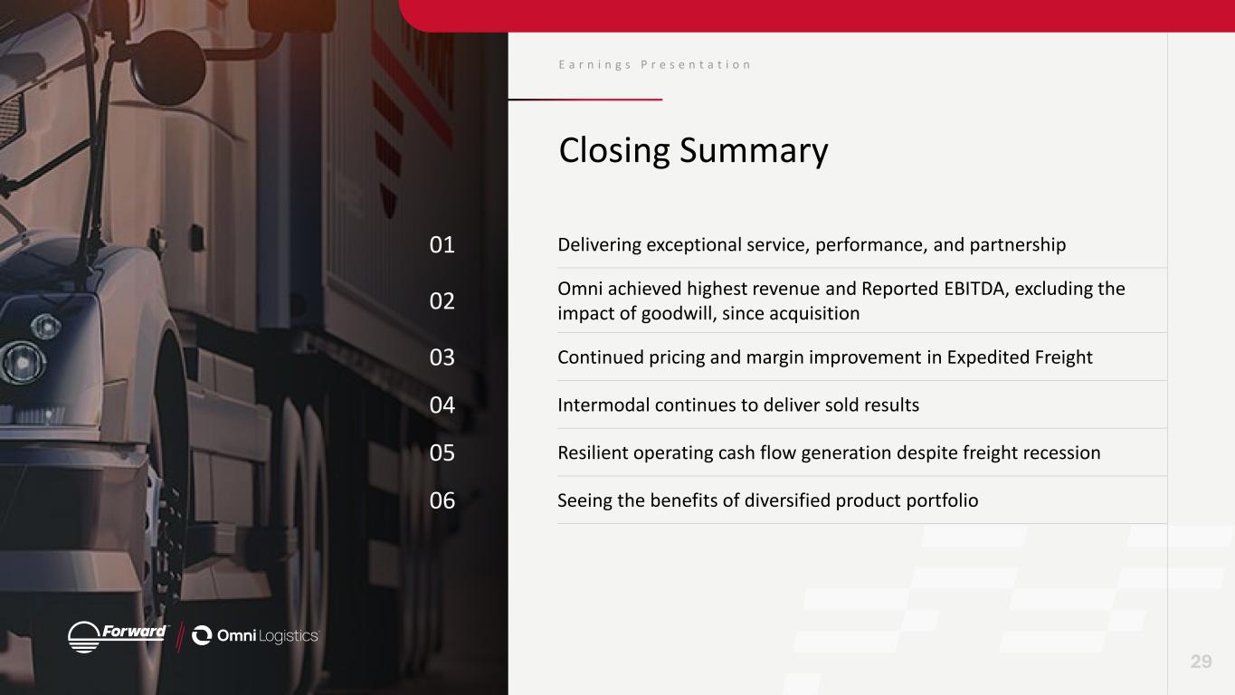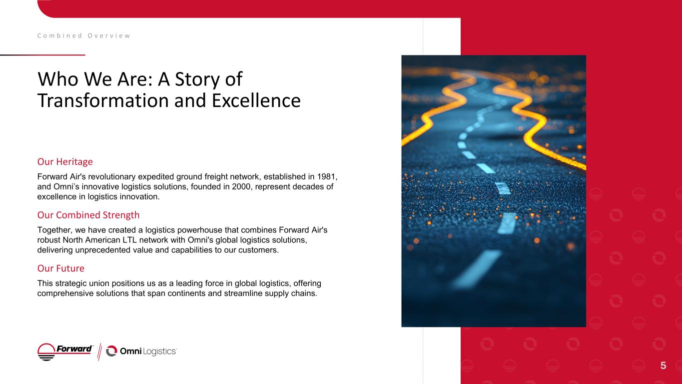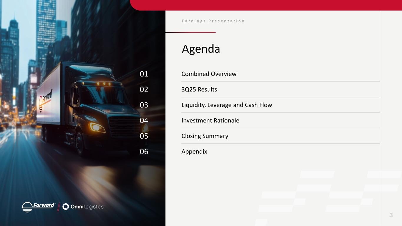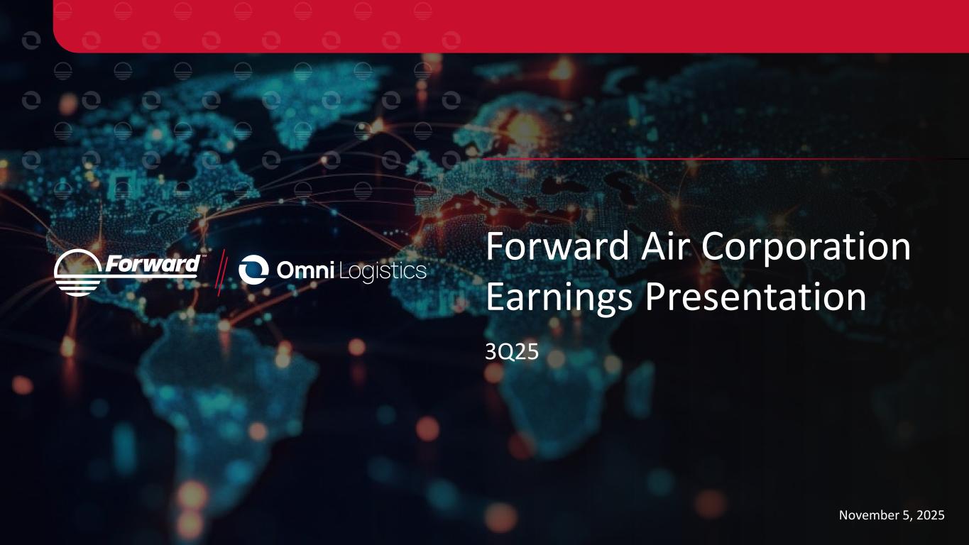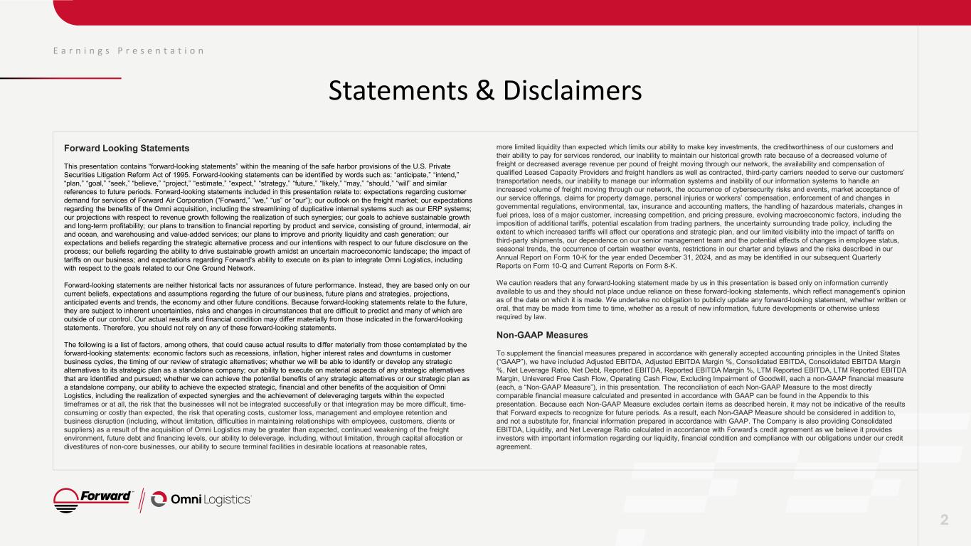 E a r n i n g s P r e s e n t a t i o n Statements & Disclaimers Forward Looking Statements This presentation contains “forward-looking statements” within the meaning of the safe harbor provisions of the U.S. Private Securities Litigation Reform Act of 1995. Forward-looking statements can be identified by words such as: “anticipate,” “intend,” “plan,” “goal,” “seek,” “believe,” “project,” “estimate,” “expect,” “strategy,” “future,” “likely,” “may,” “should,” “will” and similar references to future periods. Forward-looking statements included in this presentation relate to: expectations regarding customer demand for services of Forward Air Corporation (“Forward,” “we,” “us” or “our”); our outlook on the freight market; our expectations regarding the benefits of the Omni acquisition, including the streamlining of duplicative internal systems such as our ERP systems; our projections with respect to revenue growth following the realization of such synergies; our goals to achieve sustainable growth and long-term profitability; our plans to transition to financial reporting by product and service, consisting of ground, intermodal, air and ocean, and warehousing and value-added services; our plans to improve and priority liquidity and cash generation; our expectations and beliefs regarding the strategic alternative process and our intentions with respect to our future disclosure on the process; our beliefs regarding the ability to drive sustainable growth amidst an uncertain macroeconomic landscape; the impact of tariffs on our business; and expectations regarding Forward's ability to execute on its plan to integrate Omni Logistics, including with respect to the goals related to our One Ground Network. Forward-looking statements are neither historical facts nor assurances of future performance. Instead, they are based only on our current beliefs, expectations and assumptions regarding the future of our business, future plans and strategies, projections, anticipated events and trends, the economy and other future conditions. Because forward-looking statements relate to the future, they are subject to inherent uncertainties, risks and changes in circumstances that are difficult to predict and many of which are outside of our control. Our actual results and financial condition may differ materially from those indicated in the forward-looking statements. Therefore, you should not rely on any of these forward-looking statements. The following is a list of factors, among others, that could cause actual results to differ materially from those contemplated by the forward-looking statements: economic factors such as recessions, inflation, higher interest rates and downturns in customer business cycles, the timing of our review of strategic alternatives; whether we will be able to identify or develop any strategic alternatives to its strategic plan as a standalone company; our ability to execute on material aspects of any strategic alternatives that are identified and pursued; whether we can achieve the potential benefits of any strategic alternatives or our strategic plan as a standalone company, our ability to achieve the expected strategic, financial and other benefits of the acquisition of Omni Logistics, including the realization of expected synergies and the achievement of deleveraging targets within the expected timeframes or at all, the risk that the businesses will not be integrated successfully or that integration may be more difficult, time- consuming or costly than expected, the risk that operating costs, customer loss, management and employee retention and business disruption (including, without limitation, difficulties in maintaining relationships with employees, customers, clients or suppliers) as a result of the acquisition of Omni Logistics may be greater than expected, continued weakening of the freight environment, future debt and financing levels, our ability to deleverage, including, without limitation, through capital allocation or divestitures of non-core businesses, our ability to secure terminal facilities in desirable locations at reasonable rates, more limited liquidity than expected which limits our ability to make key investments, the creditworthiness of our customers and their ability to pay for services rendered, our inability to maintain our historical growth rate because of a decreased volume of freight or decreased average revenue per pound of freight moving through our network, the availability and compensation of qualified Leased Capacity Providers and freight handlers as well as contracted, third-party carriers needed to serve our customers’ transportation needs, our inability to manage our information systems and inability of our information systems to handle an increased volume of freight moving through our network, the occurrence of cybersecurity risks and events, market acceptance of our service offerings, claims for property damage, personal injuries or workers’ compensation, enforcement of and changes in governmental regulations, environmental, tax, insurance and accounting matters, the handling of hazardous materials, changes in fuel prices, loss of a major customer, increasing competition, and pricing pressure, evolving macroeconomic factors, including the imposition of additional tariffs, potential escalation from trading partners, the uncertainty surrounding trade policy, including the extent to which increased tariffs will affect our operations and strategic plan, and our limited visibility into the impact of tariffs on third-party shipments, our dependence on our senior management team and the potential effects of changes in employee status, seasonal trends, the occurrence of certain weather events, restrictions in our charter and bylaws and the risks described in our Annual Report on Form 10-K for the year ended December 31, 2024, and as may be identified in our subsequent