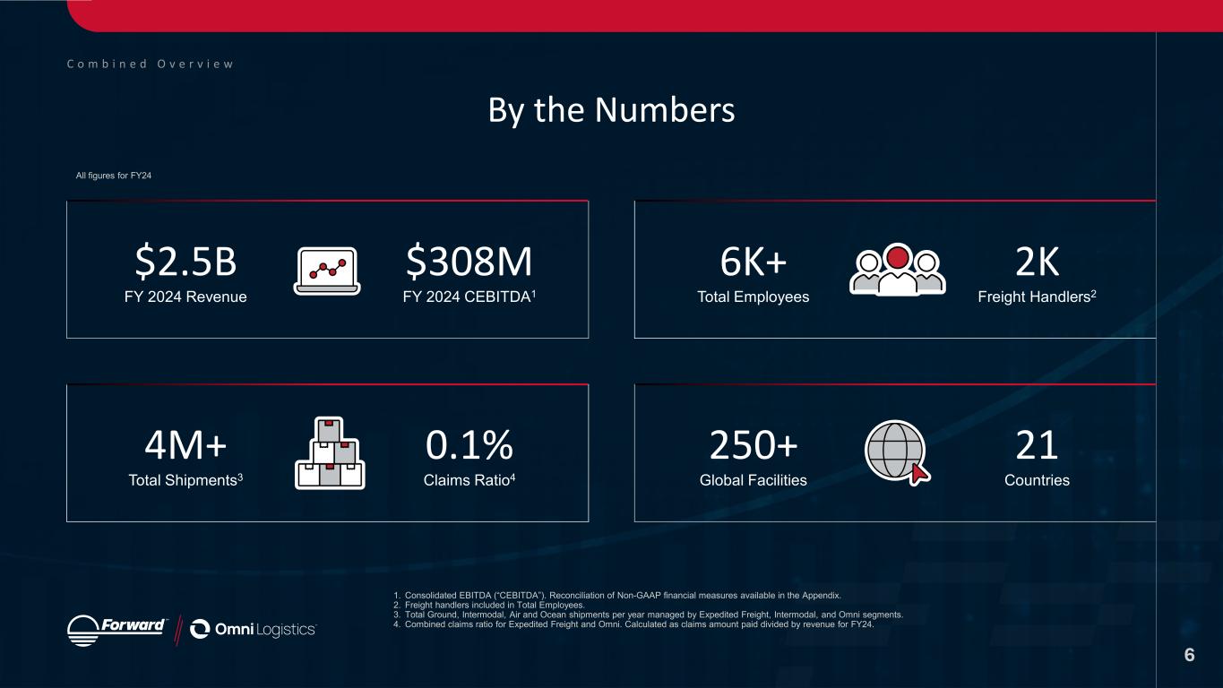 C o m b i n e d O v e r v i e w Who We Are: A Story of Transformation and Excellence Our Heritage Forward Air's revolutionary expedited ground freight network, established in 1981, and Omni’s innovative logistics solutions, founded in 2000, represent decades of excellence in logistics innovation. Our Combined Strength Together, we have created a logistics powerhouse that combines Forward Air's robust North American LTL network with Omni's global logistics solutions, delivering unprecedented value and capabilities to our customers. Our Future This strategic union positions us as a leading force in global logistics, offering comprehensive solutions that span continents and streamline supply chains. 5