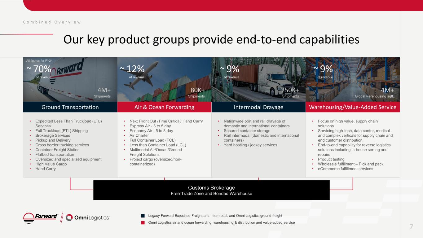 C o m b i n e d O v e r v i e w By the Numbers $2.5B FY 2024 Revenue $308M FY 2024 CEBITDA1 6K+ Total Employees 2K Freight Handlers2 4M+ Total Shipments3 0.1% Claims Ratio4 250+ Global Facilities 21 Countries 6 1. Consolidated EBITDA (“CEBITDA”). Reconciliation of Non-GAAP financial measures available in the Appendix. 2. Freight handlers included in Total Employees. 3. Total Ground, Intermodal, Air and Ocean shipments per year managed by Expedited Freight, Intermodal, and Omni segments. 4. Combined claims ratio for Expedited Freight and Omni. Calculated as claims amount paid divided by revenue for FY24. All figures for FY24
