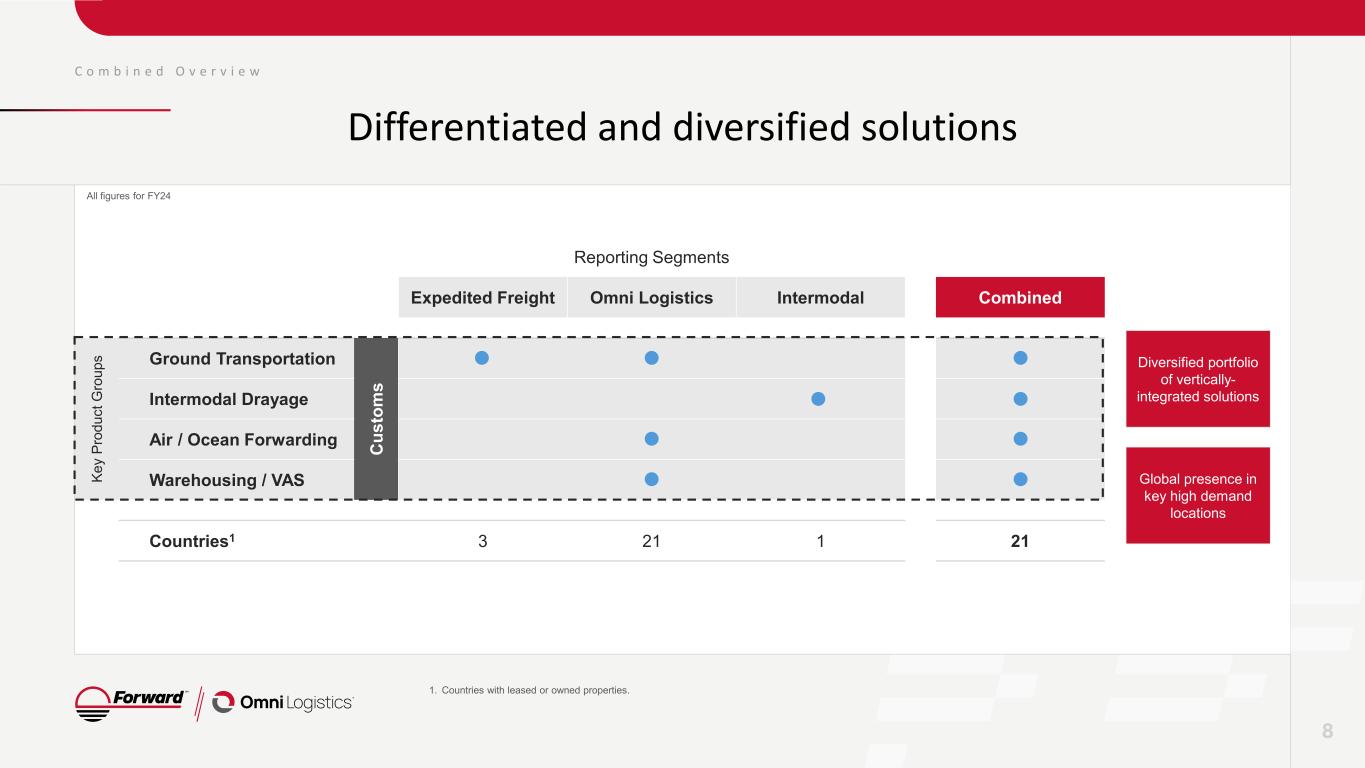 Ground Transportation Air & Ocean Forwarding Intermodal Drayage Warehousing/Value-Added Service • Expedited Less Than Truckload (LTL) Services • Full Truckload (FTL) Shipping • Brokerage Services • Pickup and Delivery • Cross border trucking services • Container Freight Station • Flatbed transportation • Oversized and specialized equipment • High Value Cargo • Hand Carry • Next Flight Out /Time Critical/ Hand Carry • Express Air - 3 to 5 day • Economy Air - 5 to 8 day • Air Charter • Full Container Load (FCL) • Less than Container Load (LCL) • Multimodal Air/Ocean/Ground Freight Solutions • Project cargo (oversized/non- containerized) • Nationwide port and rail drayage of domestic and international containers • Secured container storage • Rail intermodal (domestic and international containers) • Yard hostling / jockey services • Focus on high value, supply chain solutions • Servicing high-tech, data center, medical and complex verticals for supply chain and end customer distribution • End-to-end capability for reverse logistics solutions including in-house sorting and repairs • Product testing • Wholesale fulfillment – Pick and pack • eCommerce fulfillment services Customs Brokerage Free Trade Zone and Bonded Warehouse C o m b i n e d O v e r v i e w Our key product groups provide end-to-end capabilities 7 4M+ Shipments ~ 70% of revenue 250K+ Shipments 4M+ Global warehousing sqft. Legacy Forward Expedited Freight and Intermodal, and Omni Logistics ground freight Omni Logistics air and ocean forwarding, warehousing & distribution and value-added service All figures for FY24 80K+ Shipments ~ 12% of revenue ~ 9% of revenue ~ 9% of revenue