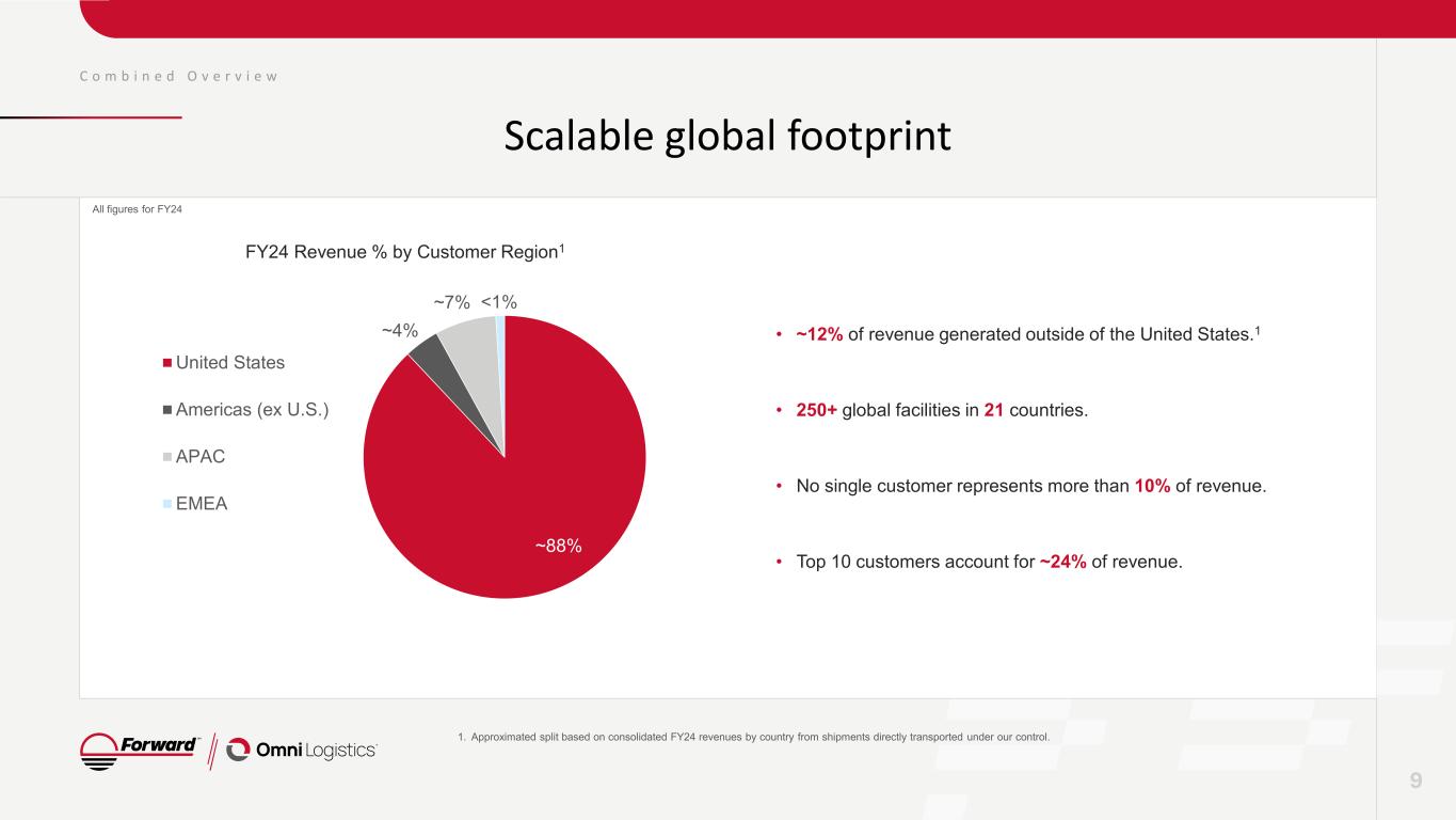 C o m b i n e d O v e r v i e w Differentiated and diversified solutions 8 Reporting Segments Expedited Freight Omni Logistics Intermodal Combined Ke y Pr od uc t G ro up s Ground Transportation C us to m s Intermodal Drayage Air / Ocean Forwarding Warehousing / VAS Countries1 3 21 1 21 Global presence in key high demand locations Diversified portfolio of vertically- integrated solutions 1. Countries with leased or owned properties. All figures for FY24