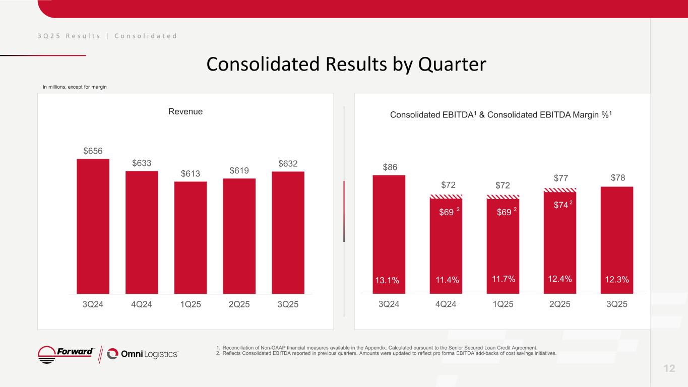 3 Q 2 5 R e s u l t s 3Q25 Highlights 3Q25 $632 Revenue $15 Operating Income $78 Consolidated EBITDA1 12.3% Margin $413 Liquidity 5.5x LTM Net Leverage2 11 1. Reconciliation of Non-GAAP financial measures available in the Appendix. 2. Calculated pursuant to Senior Secured Loan Credit Agreement. Details in the Liquidity, Leverage and Cash Flow section of this presentation. In millions, except for LTM Net Leverage