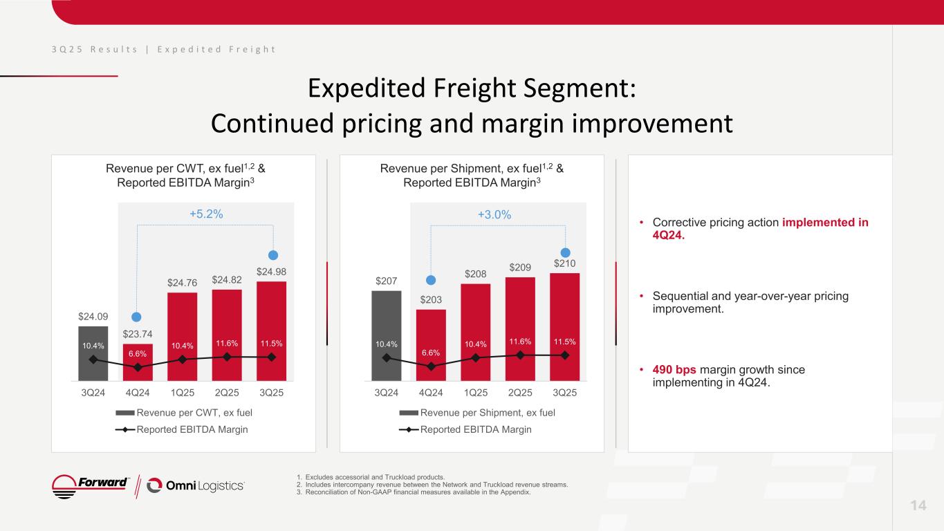 3 Q 2 5 R e s u l t s | E x p e d i t e d F r e i g h t Expedited Freight Segment Results by Quarter 1. Segment totals do not include intercompany eliminations or corporate unallocated expenses. 2. Reconciliation of Non-GAAP financial measures available in the Appendix. Excludes impairment of goodwill. Segment Revenue1 Reported EBITDA2 & Reported EBITDA Margin2 13 In millions, except for margin $285 $266 $249 $258 $259 3Q24 4Q24 1Q25 2Q25 3Q25 $30 $18 $26 $30 $30 10.4% 6.6% 10.4% 11.6% 11.5% 3Q24 4Q24 1Q25 2Q25 3Q25