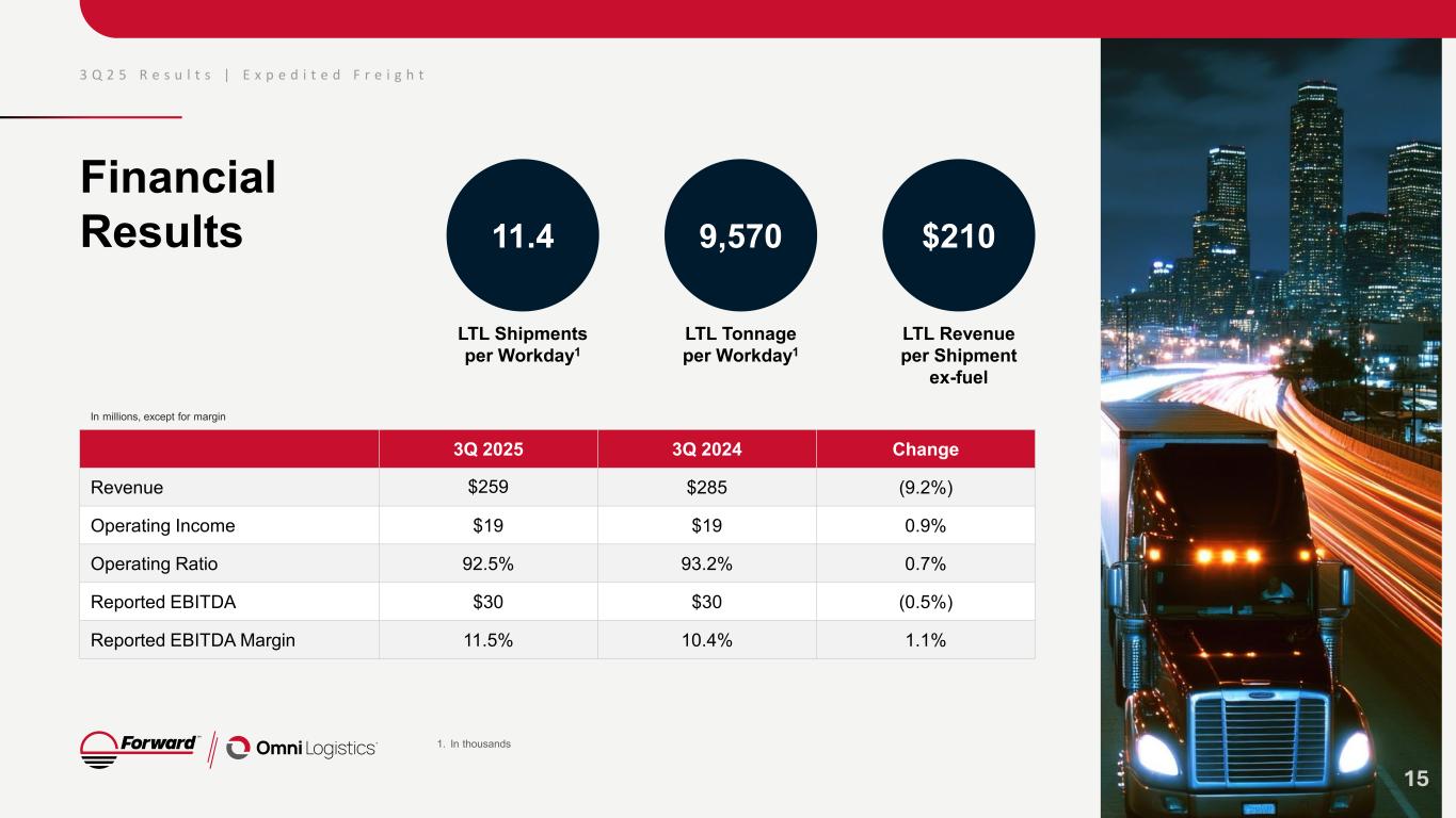 3 Q 2 5 R e s u l t s | E x p e d i t e d F r e i g h t Expedited Freight Segment: Continued pricing and margin improvement 14 Revenue per CWT, ex fuel1,2 & Reported EBITDA Margin3 Revenue per Shipment, ex fuel1,2 & Reported EBITDA Margin3 $24.09 $23.74 $24.76 $24.82 $24.98 10.4% 6.6% 10.4% 11.6% 11.5% 3Q24 4Q24 1Q25 2Q25 3Q25 Revenue per CWT, ex fuel Reported EBITDA Margin +5.2% $207 $203 $208 $209 $210 10.4% 6.6% 10.4% 11.6% 11.5% 3Q24 4Q24 1Q25 2Q25 3Q25 Revenue per Shipment, ex fuel Reported EBITDA Margin +3.0% 1. Excludes accessorial and Truckload products. 2. Includes intercompany revenue between the Network and Truckload revenue streams. 3. Reconciliation of Non-GAAP financial measures available in the Appendix. • Corrective pricing action implemented in 4Q24. • Sequential and year-over-year pricing improvement. • 490 bps margin growth since implementing in 4Q24.