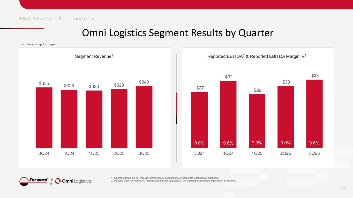 0.18% 0.14% 0.12% 0.13% 0.13% 0.15% 0.12% 2021 2022 2023 2024 1Q25 2Q25 3Q25 3 Q 2 5 R e s u l t s | E x p e d i t e d F r e i g h t Expedited Freight Segment: Continued superior service following acquisition 16 Omni acquisition Expedited Freight Segment Claims Ratio1 • Industry-leading claims ratio of ~0.1%. • Superior service to 96% of all continental United States zip codes. • Maintaining priority focus on customer service during integration and transformation. 1. Expedited Freight segment only. Calculated as claims amount paid divided by revenue.