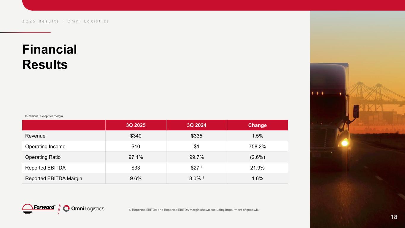 3 Q 2 5 R e s u l t s | O m n i L o g i s t i c s Omni Logistics Segment Results by Quarter Reported EBITDA2 & Reported EBITDA Margin %2Segment Revenue1 17 1. Segment totals do not include intercompany eliminations or corporate unallocated expenses 2. Reconciliation of Non-GAAP financial measures available in the Appendix. Excludes impairment of goodwill. $335 $326 $323 $328 $340 3Q24 4Q24 1Q25 2Q25 3Q25 In millions, except for margin $27 $32 $26 $30 $33 8.0% 9.8% 7.9% 9.0% 9.6% 3Q24 4Q24 1Q25 2Q25 3Q25