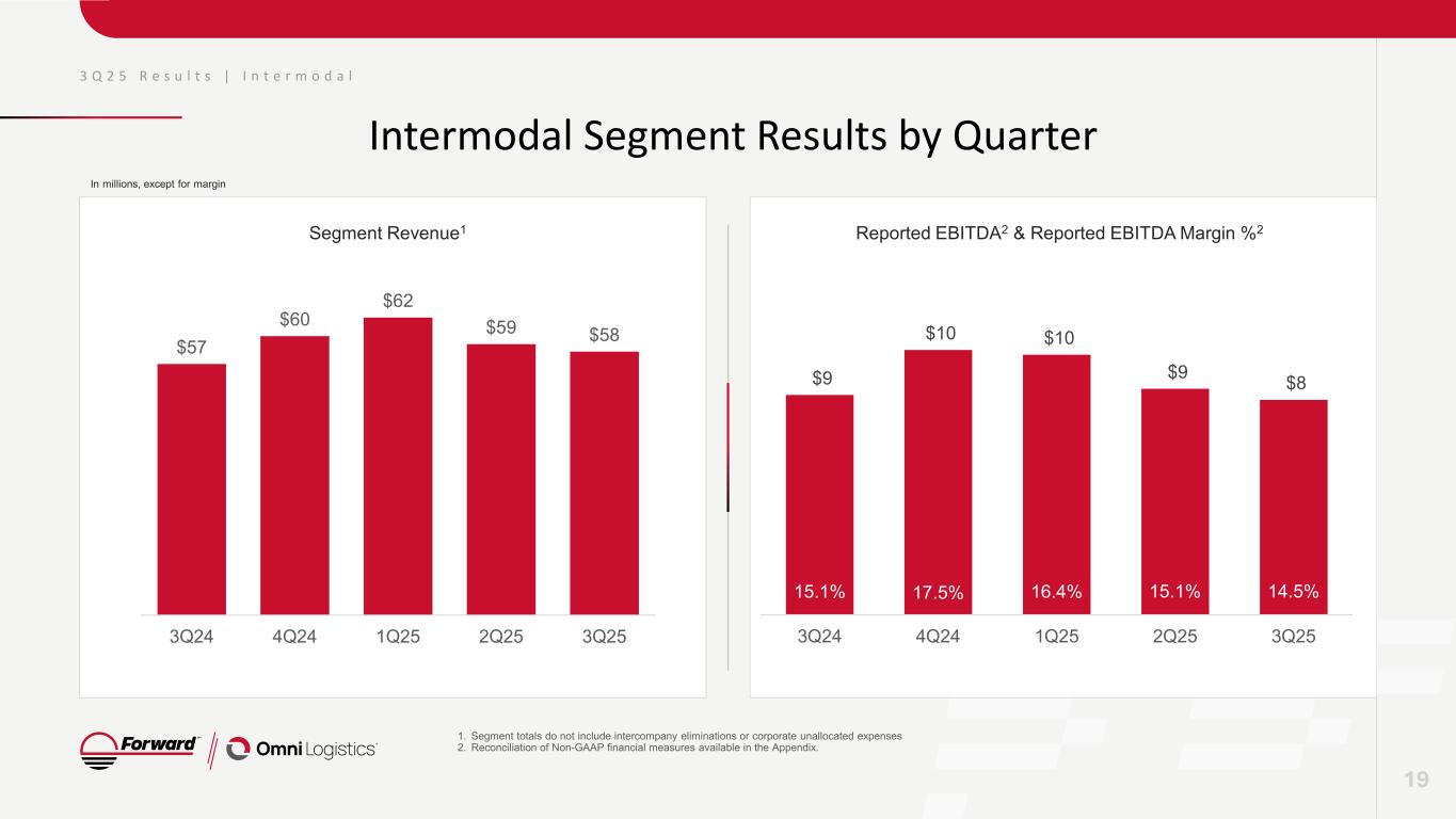 Financial Results 3Q 2025 3Q 2024 Change Revenue $340 $335 1.5% Operating Income $10 $1 758.2% Operating Ratio 97.1% 99.7% (2.6%) Reported EBITDA $33 $27 1 21.9% Reported EBITDA Margin 9.6% 8.0% 1 1.6% 3 Q 2 5 R e s u l t s | O m n i L o g i s t i c s In millions, except for margin 18 1. Reported EBITDA and Reported EBITDA Margin shown excluding impairment of goodwill.