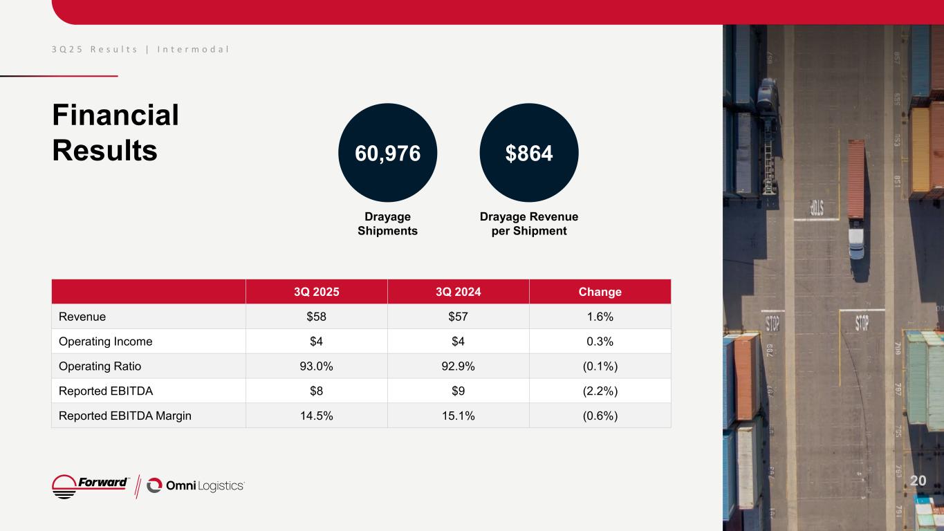 3 Q 2 5 R e s u l t s | I n t e r m o d a l Intermodal Segment Results by Quarter 1. Segment totals do not include intercompany eliminations or corporate unallocated expenses 2. Reconciliation of Non-GAAP financial measures available in the Appendix. Reported EBITDA2 & Reported EBITDA Margin %2Segment Revenue1 $57 $60 $62 $59 $58 3Q24 4Q24 1Q25 2Q25 3Q25 In millions, except for margin 19 $9 $10 $10 $9 $8 15.1% 17.5% 16.4% 15.1% 14.5% 3Q24 4Q24 1Q25 2Q25 3Q25
