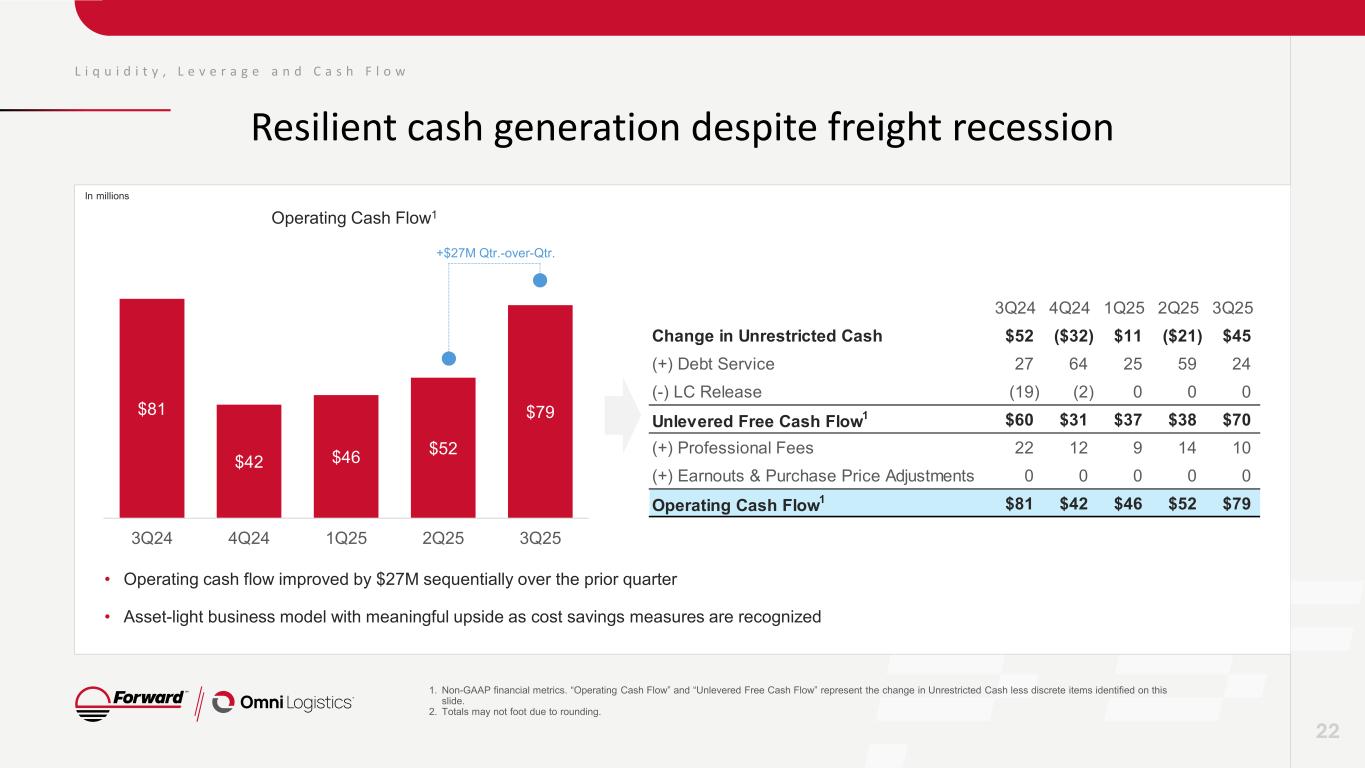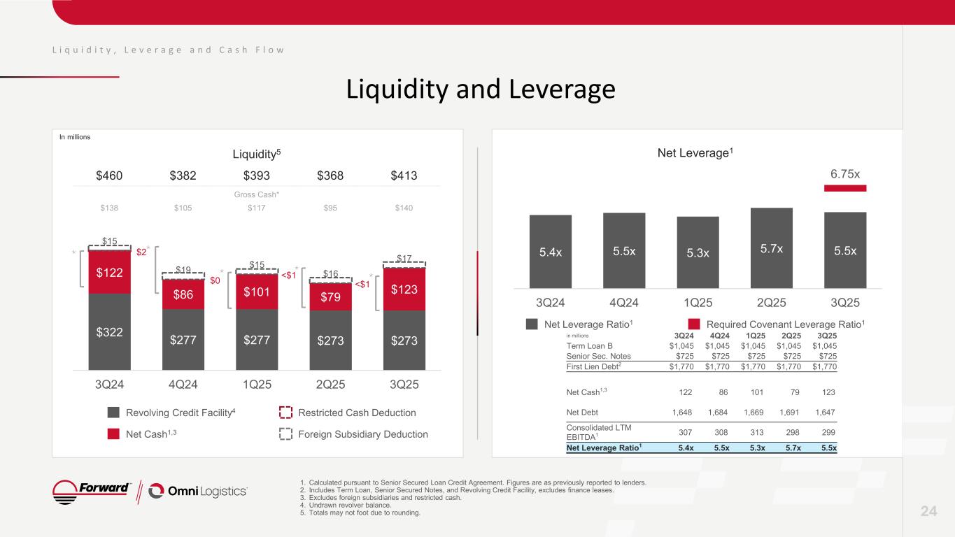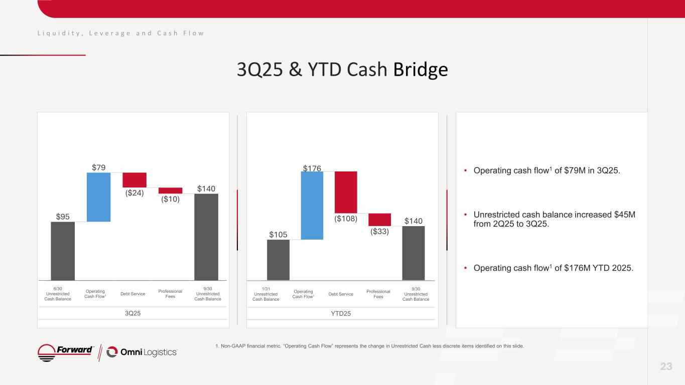 $81 $42 $46 $52 $79 3Q24 4Q24 1Q25 2Q25 3Q25 L i q u i d i t y , L e v e r a g e a n d C a s h F l o w Resilient cash generation despite freight recession 1. Non-GAAP financial metrics. “Operating Cash Flow” and “Unlevered Free Cash Flow” represent the change in Unrestricted Cash less discrete items identified on this slide. 2. Totals may not foot due to rounding. 22 • Operating cash flow improved by $27M sequentially over the prior quarter • Asset-light business model with meaningful upside as cost savings measures are recognized Operating Cash Flow1 In millions +$27M Qtr.-over-Qtr. 3Q24 4Q24 1Q25 2Q25 3Q25 Change in Unrestricted Cash $52 ($32) $11 ($21) $45 (+) Debt Service 27 64 25 59 24 (-) LC Release (19) (2) 0 0 0 Unlevered Free Cash Flow1 $60 $31 $37 $38 $70 (+) Professional Fees 22 12 9 14 10 (+) Earnouts & Purchase Price Adjustments 0 0 0 0 0 Operating Cash Flow1 $81 $42 $46 $52 $79