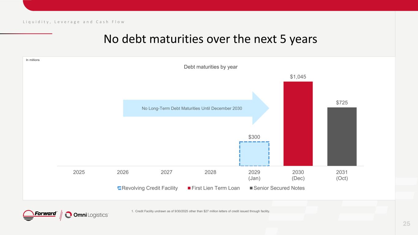 $322 $277 $277 $273 $273 $122 $86 $101 $79 $123 $2 $0 <$1 <$1 $15 $19 $15 $16 $17 3Q24 4Q24 1Q25 2Q25 3Q25 L i q u i d i t y , L e v e r a g e a n d C a s h F l o w Liquidity and Leverage Net Leverage1 Net Leverage Ratio1 Required Covenant Leverage Ratio1 Net Cash1,3 Revolving Credit Facility4 Restricted Cash Deduction Foreign Subsidiary Deduction * 24 * * * * 1. Calculated pursuant to Senior Secured Loan Credit Agreement. Figures are as previously reported to lenders. 2. Includes Term Loan, Senior Secured Notes, and Revolving Credit Facility, excludes finance leases. 3. Excludes foreign subsidiaries and restricted cash. 4. Undrawn revolver balance. 5. Totals may not foot due to rounding. In millions 5.4x 5.5x 5.3x 5.7x 5.5x 6.75x 3Q24 4Q24 1Q25 2Q25 3Q25 Liquidity5 $460 $382 $393 $368 $413 Gross Cash* $138 $105 $117 $95 $140 in millions 3Q24 4Q24 1Q25 2Q25 3Q25 Term Loan B $1,045 $1,045 $1,045 $1,045 $1,045 Senior Sec. Notes $725 $725 $725 $725 $725 First Lien Debt2 $1,770 $1,770 $1,770 $1,770 $1,770 Net Cash1,3 122 86 101 79 123 Net Debt 1,648 1,684 1,669 1,691 1,647 Consolidated LTM EBITDA1 307 308 313 298 299 Net Leverage Ratio1 5.4x 5.5x 5.3x 5.7x 5.5x