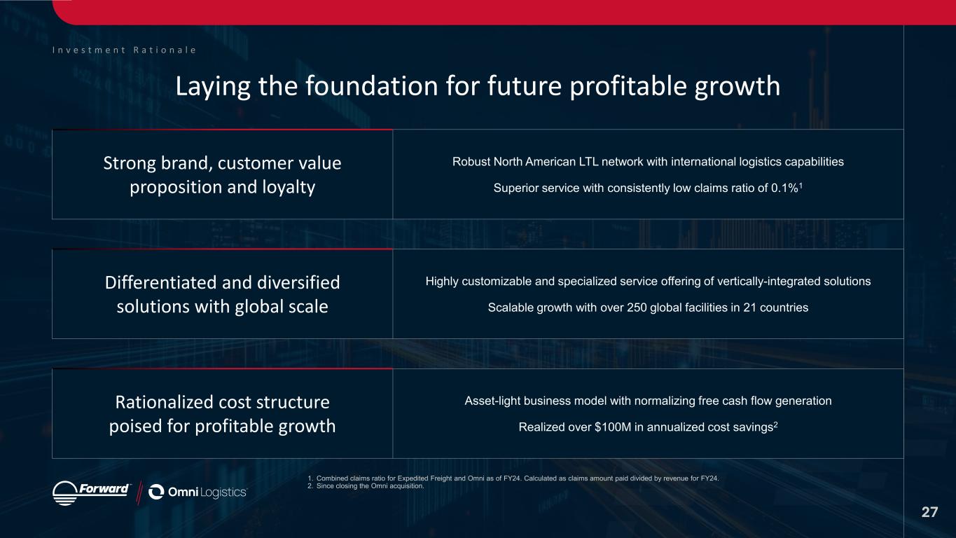 I n v e s t m e n t R a t i o n a l e Laying the foundation for future profitable growth Strong brand, customer value proposition and loyalty Robust North American LTL network with international logistics capabilities Superior service with consistently low claims ratio of 0.1%1 Differentiated and diversified solutions with global scale Highly customizable and specialized service offering of vertically-integrated solutions Scalable growth with over 250 global facilities in 21 countries Rationalized cost structure poised for profitable growth Asset-light business model with normalizing free cash flow generation Realized over $100M in annualized cost savings2 27 1. Combined claims ratio for Expedited Freight and Omni as of FY24. Calculated as claims amount paid divided by revenue for FY24. 2. Since closing the Omni acquisition.