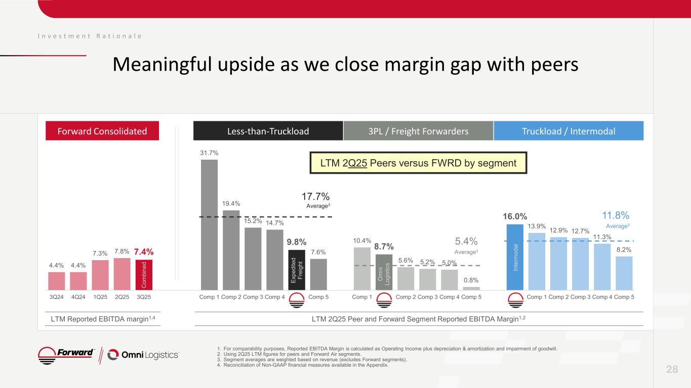 4.4% 4.4% 7.3% 7.8% 7.4% 31.7% 19.4% 15.2% 14.7% 9.8% 7.6% 10.4% 8.7% 5.6% 5.2% 5.0% 0.8% 16.0% 13.9% 12.9% 12.7% 11.3% 8.2% 3Q24 4Q24 1Q25 2Q25 3Q25 Comp 1 Comp 2 Comp 3 Comp 4 Comp 5 Comp 1 Comp 2 Comp 3 Comp 4 Comp 5 Comp 1 Comp 2 Comp 3 Comp 4 Comp 5 I n v e s t m e n t R a t i o n a l e Meaningful upside as we close margin gap with peers 1. For comparability purposes, Reported EBITDA Margin is calculated as Operating Income plus depreciation & amortization and impairment of goodwill. 2. Using 2Q25 LTM figures for peers and Forward Air segments. 3. Segment averages are weighted based on revenue (excludes Forward segments). 4. Reconciliation of Non-GAAP financial measures available in the Appendix. 17.7% Average3 5.4% Average3 11.8% Average3 28 Forward Consolidated Less-than-Truckload 3PL / Freight Forwarders Truckload / Intermodal LTM Reported EBITDA margin1,4 LTM 2Q25 Peer and Forward Segment Reported EBITDA Margin1,2 Ex pe di te d Fr ei gh t O m ni Lo gi st ic s In te rm od al C om bi ne d LTM 2Q25 Peers versus FWRD by segment