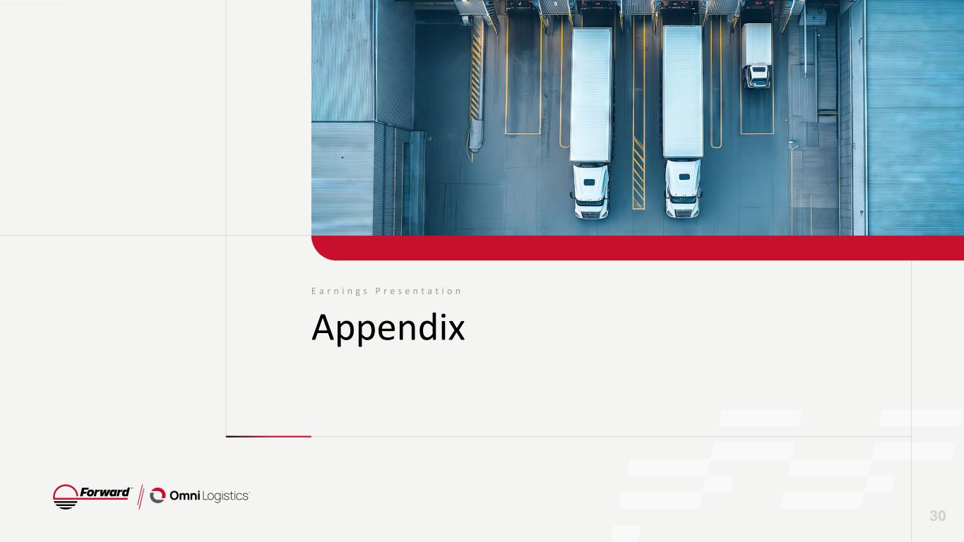 E a r n i n g s P r e s e n t a t i o n Closing Summary 01 Delivering exceptional service, performance, and partnership 02 Omni achieved highest revenue and Reported EBITDA, excluding the impact of goodwill, since acquisition 03 Continued pricing and margin improvement in Expedited Freight 04 Intermodal continues to deliver sold results 05 Resilient operating cash flow generation despite freight recession 06 Seeing the benefits of diversified product portfolio 29