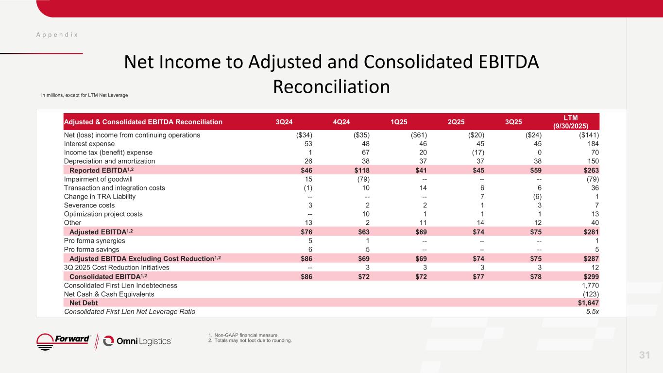 A p p e n d i x Net Income to Adjusted and Consolidated EBITDA Reconciliation 31 1. Non-GAAP financial measure. 2. Totals may not foot due to rounding. In millions, except for LTM Net Leverage Adjusted & Consolidated EBITDA Reconciliation 3Q24 4Q24 1Q25 2Q25 3Q25 LTM (9/30/2025) Net (loss) income from continuing operations ($34) ($35) ($61) ($20) ($24) ($141) Interest expense 53 48 46 45 45 184 Income tax (benefit) expense 1 67 20 (17) 0 70 Depreciation and amortization 26 38 37 37 38 150 Reported EBITDA1,2 $46 $118 $41 $45 $59 $263 Impairment of goodwill 15 (79) -- -- -- (79) Transaction and integration costs (1) 10 14 6 6 36 Change in TRA Liability -- -- -- 7 (6) 1 Severance costs 3 2 2 1 3 7 Optimization project costs -- 10 1 1 1 13 Other 13 2 11 14 12 40 Adjusted EBITDA1,2 $76 $63 $69 $74 $75 $281 Pro forma synergies 5 1 -- -- -- 1 Pro forma savings 6 5 -- -- -- 5 Adjusted EBITDA Excluding Cost Reduction1,2 $86 $69 $69 $74 $75 $287 3Q 2025 Cost Reduction Initiatives -- 3 3 3 3 12 Consolidated EBITDA1,2 $86 $72 $72 $77 $78 $299 Consolidated First Lien Indebtedness 1,770 Net Cash & Cash Equivalents (123) Net Debt $1,647 Consolidated First Lien Net Leverage Ratio 5.5x