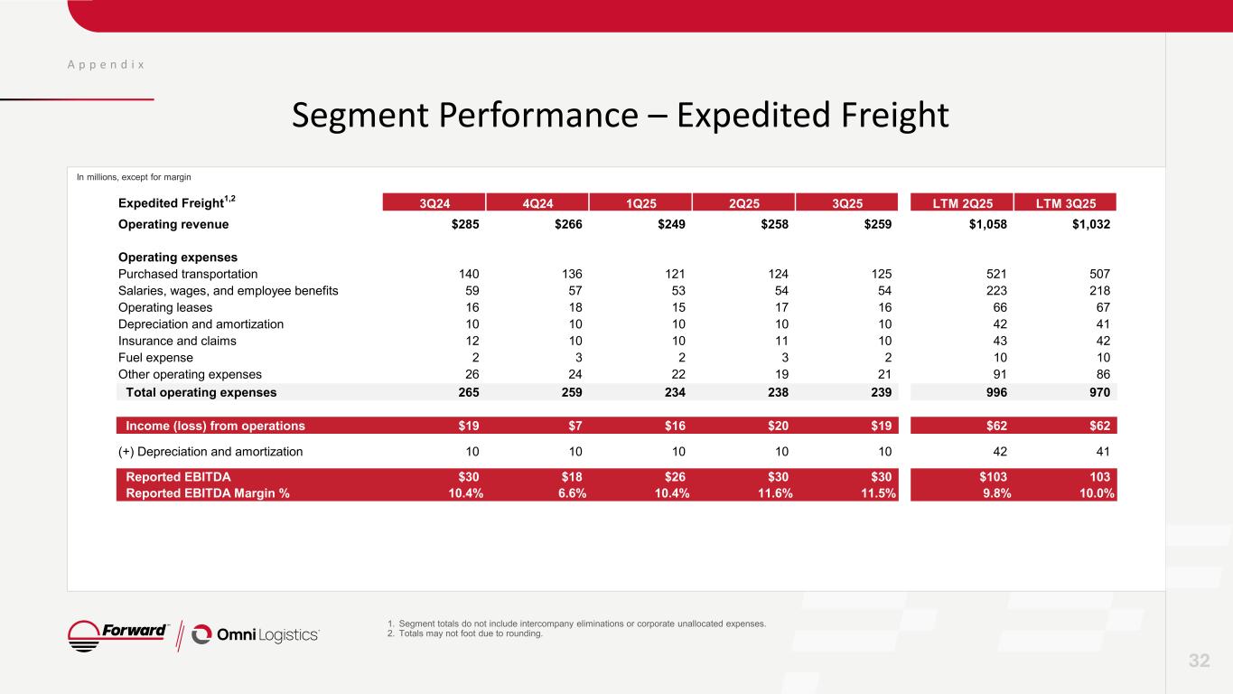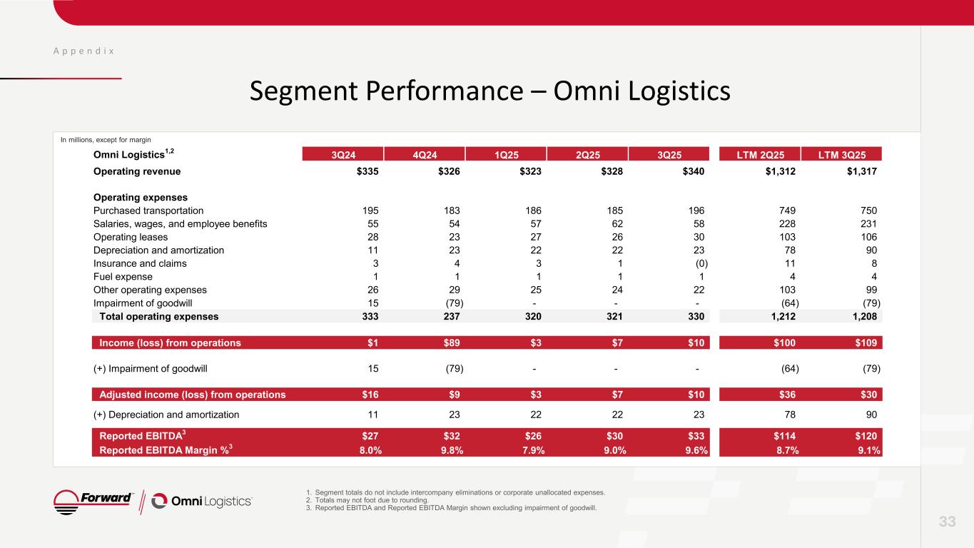 A p p e n d i x Segment Performance – Expedited Freight 32 1. Segment totals do not include intercompany eliminations or corporate unallocated expenses. 2. Totals may not foot due to rounding. In millions, except for margin Expedited Freight1,2 3Q24 4Q24 1Q25 2Q25 3Q25 LTM 2Q25 LTM 3Q25 Operating revenue $285 $266 $249 $258 $259 $1,058 $1,032 Operating expenses Purchased transportation 140 136 121 124 125 521 507 Salaries, wages, and employee benefits 59 57 53 54 54 223 218 Operating leases 16 18 15 17 16 66 67 Depreciation and amortization 10 10 10 10 10 42 41 Insurance and claims 12 10 10 11 10 43 42 Fuel expense 2 3 2 3 2 10 10 Other operating expenses 26 24 22 19 21 91 86 Total operating expenses 265 259 234 238 239 996 970 Income (loss) from operations $19 $7 $16 $20 $19 $62 $62 (+) Depreciation and amortization 10 10 10 10 10 42 41 Reported EBITDA $30 $18 $26 $30 $30 $103 103 Reported EBITDA Margin % 10.4% 6.6% 10.4% 11.6% 11.5% 9.8% 10.0%