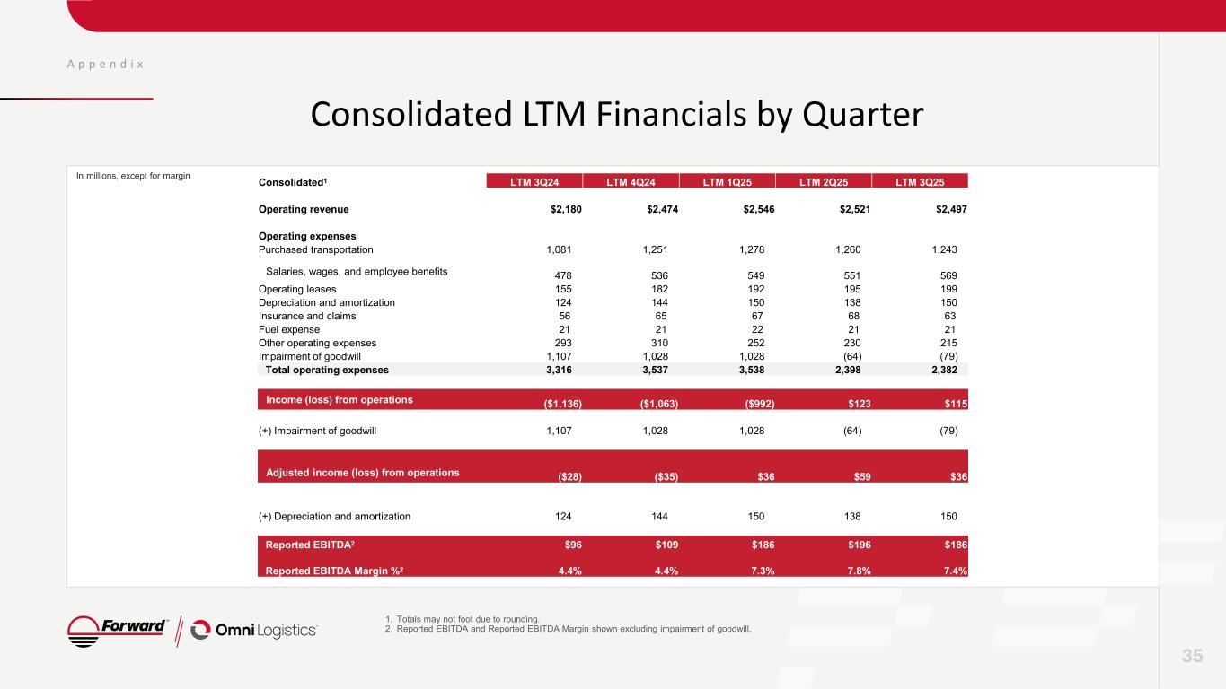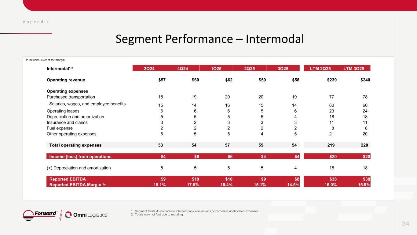 A p p e n d i x Segment Performance – Omni Logistics 33 1. Segment totals do not include intercompany eliminations or corporate unallocated expenses. 2. Totals may not foot due to rounding. 3. Reported EBITDA and Reported EBITDA Margin shown excluding impairment of goodwill. In millions, except for margin Omni Logistics1,2 3Q24 4Q24 1Q25 2Q25 3Q25 LTM 2Q25 LTM 3Q25 Operating revenue $335 $326 $323 $328 $340 $1,312 $1,317 Operating expenses Purchased transportation 195 183 186 185 196 749 750 Salaries, wages, and employee benefits 55 54 57 62 58 228 231 Operating leases 28 23 27 26 30 103 106 Depreciation and amortization 11 23 22 22 23 78 90 Insurance and claims 3 4 3 1 (0) 11 8 Fuel expense 1 1 1 1 1 4 4 Other operating expenses 26 29 25 24 22 103 99 Impairment of goodwill 15 (79) - - - (64) (79) Total operating expenses 333 237 320 321 330 1,212 1,208 Income (loss) from operations $1 $89 $3 $7 $10 $100 $109 (+) Impairment of goodwill 15 (79) - - - (64) (79) Adjusted income (loss) from operations $16 $9 $3 $7 $10 $36 $30 (+) Depreciation and amortization 11 23 22 22 23 78 90 Reported EBITDA3 $27 $32 $26 $30 $33 $114 $120 Reported EBITDA Margin %3 8.0% 9.8% 7.9% 9.0% 9.6% 8.7% 9.1%
