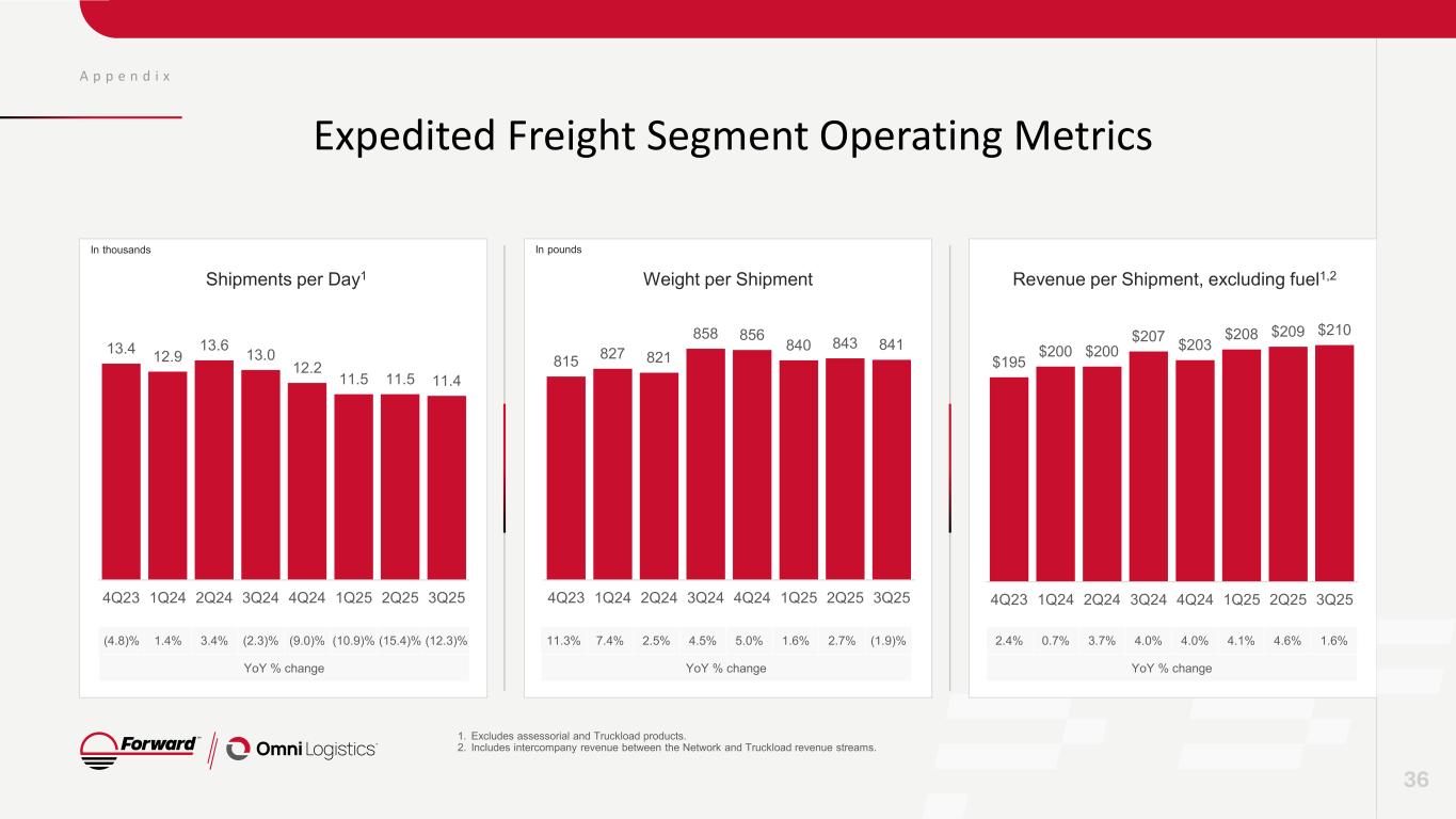 A p p e n d i x Consolidated LTM Financials by Quarter 35 1. Totals may not foot due to rounding. 2. Reported EBITDA and Reported EBITDA Margin shown excluding impairment of goodwill. In millions, except for margin Consolidated1 LTM 3Q24 LTM 4Q24 LTM 1Q25 LTM 2Q25 LTM 3Q25 Operating revenue $2,180 $2,474 $2,546 $2,521 $2,497 Operating expenses Purchased transportation 1,081 1,251 1,278 1,260 1,243 Salaries, wages, and employee benefits 478 536 549 551 569 Operating leases 155 182 192 195 199 Depreciation and amortization 124 144 150 138 150 Insurance and claims 56 65 67 68 63 Fuel expense 21 21 22 21 21 Other operating expenses 293 310 252 230 215 Impairment of goodwill 1,107 1,028 1,028 (64) (79) Total operating expenses 3,316 3,537 3,538 2,398 2,382 Income (loss) from operations ($1,136) ($1,063) ($992) $123 $115 (+) Impairment of goodwill 1,107 1,028 1,028 (64) (79) Adjusted income (loss) from operations ($28) ($35) $36 $59 $36 (+) Depreciation and amortization 124 144 150 138 150 Reported EBITDA2 $96 $109 $186 $196 $186 Reported EBITDA Margin %2 4.4% 4.4% 7.3% 7.8% 7.4%