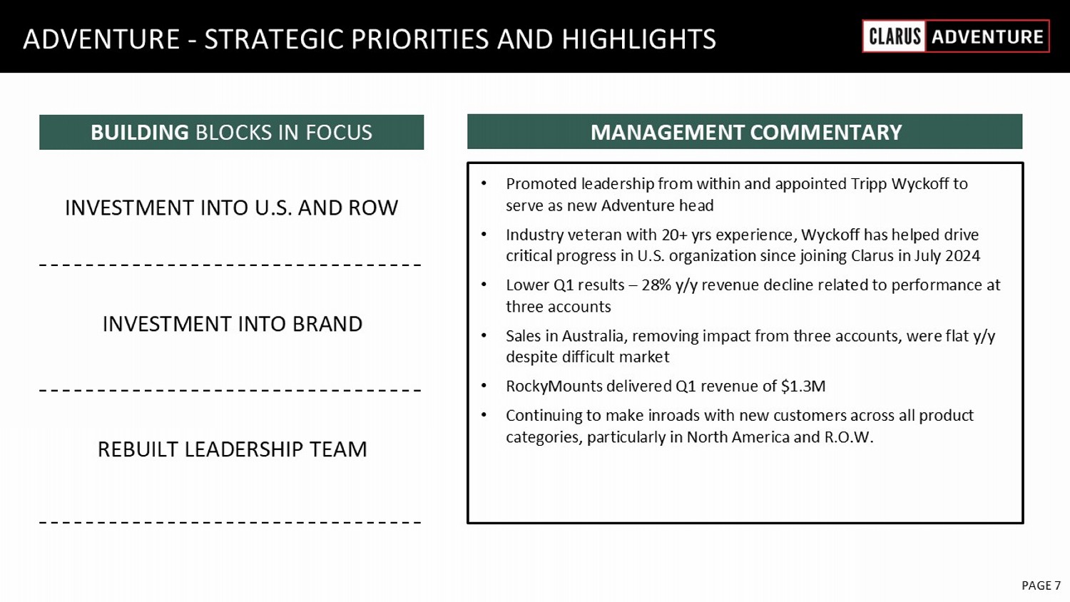 6 February 2023 PAGE 6 OUTDOOR - STRATEGIC PRIORITIES AND HIGHLIGHTS • Delivering on commitment to reshape business • Important progress on simplification over the last two years puts Black Diamond in far better position to manage current period of uncertainty stemming from U.S. global trade policies • Lower Q1 gross margin was due to higher mix and quantity of discontinued merchandise, plus one - time cost items • Enhanced inventories - down 3.5% y/y - with 74% of value in most profitable “A” styles • Healthy order book for F/W winter season, with initial apparel bookings up 30% in Europe and 50% in North America • Actively implementing solutions to offset the cost impact of tariffs, taking a long - term view to emerge in an even stronger competitive position MANAGEMENT COMMENTARY BUILDING BLOCKS IN FOCUS SIMPLIFICATION EXECUTION PRODUCT LEADERSHIP FEWER, BIGGER, BETTER