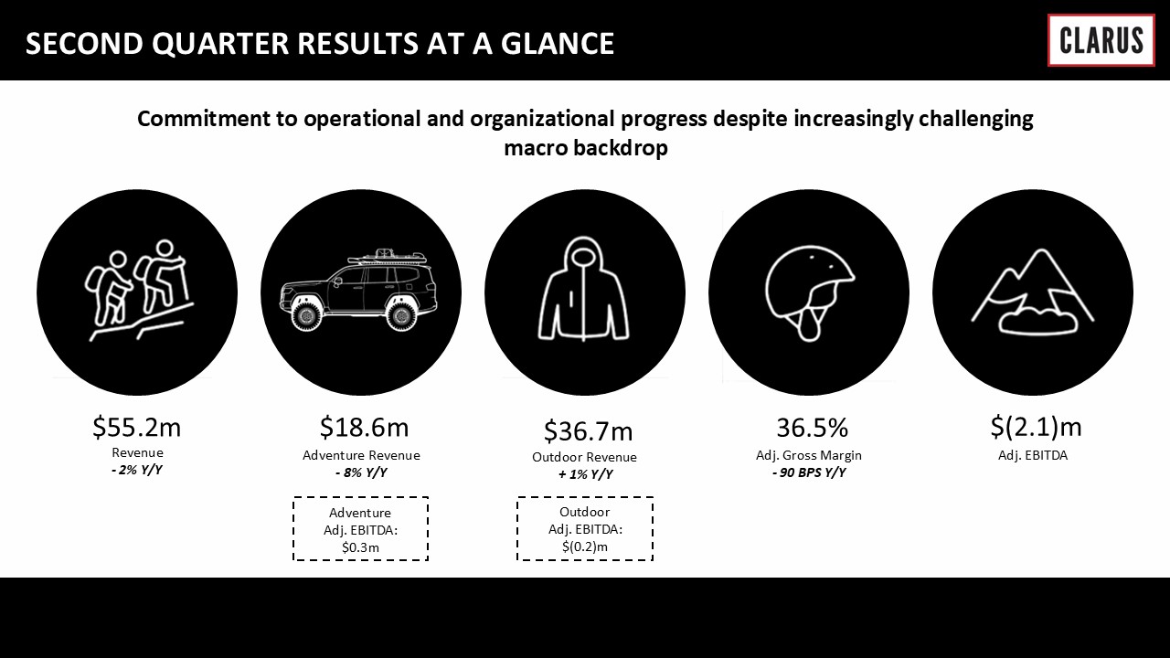 Commitment to operational and organizational progress despite increasingly challenging macro backdrop $55.2 m $ 18.6m $ 36.7m 36.5 % $( 2.1)m Revenue - 2% Y/Y Adventure Revenue - 8% Y/Y Outdoor Revenue + 1% Y/Y Adj. Gross Margin - 90 BPS Y/Y Adj. EBITDA SECOND QUARTER RESULTS AT A GLANCE Adventure Adj. EBITDA: $0.3m Outdoor Adj. EBITDA: $(0.2)m