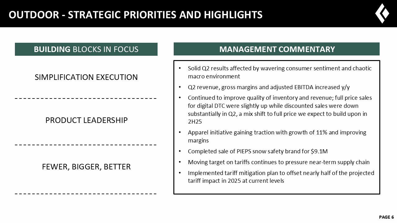 6 February 2023 PAGE 6 OUTDOOR - STRATEGIC PRIORITIES AND HIGHLIGHTS • Solid Q2 results affected by wavering consumer sentiment and chaotic macro environment • Q2 revenue, gross margins and adjusted EBITDA increased y/y • Continued to improve quality of inventory and revenue; full price sales for digital DTC were slightly up while discounted sales were down substantially in Q2, a mix shift to full price we expect to build upon in 2H25 • Apparel initiative gaining traction with growth of 11% and improving margins • Completed sale of PIEPS snow safety brand for $9.1M • Moving target on tariffs continues to pressure near - term supply chain • Implemented tariff mitigation plan to offset nearly half of the projected tariff impact in 2025 at current levels MANAGEMENT COMMENTARY BUILDING BLOCKS IN FOCUS SIMPLIFICATION EXECUTION PRODUCT LEADERSHIP FEWER, BIGGER, BETTER