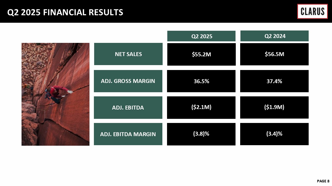 6 February 2023 PAGE 8 NET SALES Q2 2025 FINANCIAL RESULTS Q2 202 5 ADJ. GROSS MARGIN ADJ. EBITDA ADJ. EBITDA MARGIN (3.8)% ($2.1M) 36.5% $ 55.2 M Q2 202 4 (3.4)% ($1.9M) 37.4% $ 56.5 M