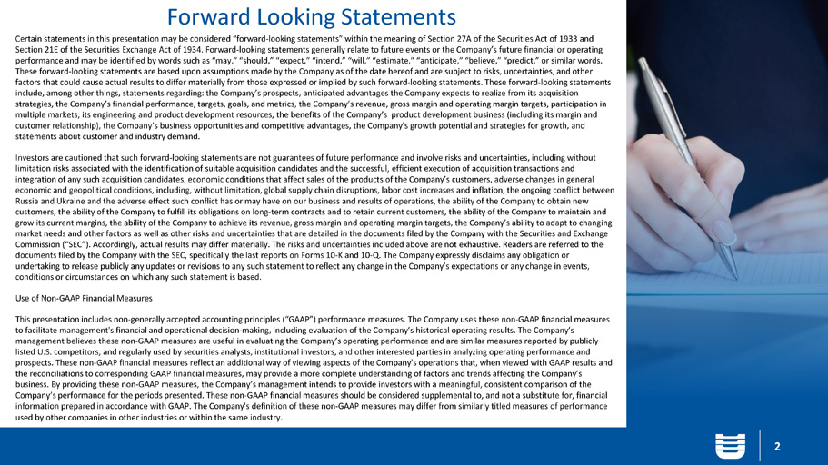 Forward Looking Statements 2 Certain statements in this presentation may be considered “forward - looking statements” within the meaning of Section 27A of the Securities Act of 1933 and Section 21E of the Securities Exchange Act of 1934. Forward - looking statements generally relate to future events or the Company’ s future financial or operating performance and may be identified by words such as “may,” “should,” “expect,” “intend,” “will,” “estimate,” “anticipate,” “be lie ve,” “predict,” or similar words. These forward - looking statements are based upon assumptions made by the Company as of the date hereof and are subject to risks, uncertainties, and other factors that could cause actual results to differ materially from those expressed or implied by such forward - looking statements. These forward - looking statements include, among other things, statements regarding: the Company’s prospects, anticipated advantages the Company expects to rea liz e from its acquisition strategies, the Company’s financial performance, targets, goals, and metrics, the Company’s revenue, gross margin and operati ng margin targets, participation in multiple markets, its engineering and product development resources, the benefits of the Company’s product development busin ess (including its margin and customer relationship), the Company’s business opportunities and competitive advantages, the Company’s growth potential and s tra tegies for growth, and statements about customer and industry demand. Investors are cautioned that such forward - looking statements are not guarantees of future performance and involve risks and unce rtainties, including without limitation risks associated with the identification of suitable acquisition candidates and the successful, efficient executio n o f acquisition transactions and integration of any such acquisition candidates, economic conditions that affect sales of the products of the Company’s custom ers , adverse changes in general economic and geopolitical conditions, including, without limitation, global supply chain disruptions, labor cost increases an d i nflation, the ongoing conflict between Russia and Ukraine and the adverse effect such conflict has or may have on our business and results of operations, the ability of the Company to obtain new customers, the ability of the Company to fulfill its obligations on long - term contracts and to retain current customers, the abi lity of the Company to maintain and grow its current margins, the ability of the Company to achieve its revenue, gross margin and operating margin targets, the C omp any’s ability to adapt to changing market needs and other factors as well as other risks and uncertainties that are detailed in the documents filed by the Compa ny with the Securities and Exchange Commission (“SEC”). Accordingly, actual results may differ materially. The risks and uncertainties included above are not exh aus tive. Readers are referred to the documents filed by the Company with the SEC, specifically the last reports on Forms 10 - K and 10 - Q. The Company expressly disclai ms any obligation or undertaking to release publicly any updates or revisions to any such statement to reflect any change in the Company’s expecta tio ns or any change in events, conditions or circumstances on which any such statement is based. Use of Non - GAAP Financial Measures This presentation includes non - generally accepted accounting principles (“GAAP”) performance measures. The Company uses these no n - GAAP financial measures to facilitate management's financial and operational decision - making, including evaluation of the Company’s historical operating results. The Company’s management believes these non - GAAP measures are useful in evaluating the Company’s operating performance and are similar measure s reported by publicly listed U.S. competitors, and regularly used by securities analysts, institutional investors, and other interested parties in ana lyzing operating performance and prospects. These non - GAAP financial measures reflect an additional way of viewing aspects of the Company's operations that, when viewed with GAAP results and the reconciliations to corresponding GAAP financial measures, may provide a more complete understanding of factors and trends af fecting the Company’s business. By providing these non - GAAP measures, the Company’s management intends to provide investors with a meaningful, consist ent comparison of the Company’s performance for the periods presented. These non - GAAP financial measures should be considered supplemental to, and not a substitute for, financial information prepared in accordance with GAAP. The Company's definition of these non - GAAP measures may differ from similarly titl ed measures of performance used by other companies in other industries or within the same industry .