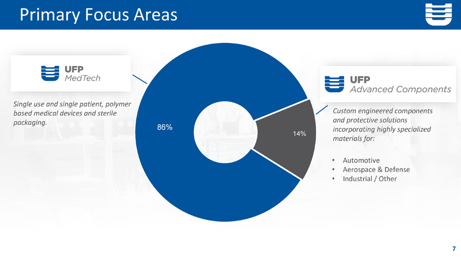 Advanced Components 10 INDUSTRIAL AUTOMOTIVE AEROSPACE & DEFENSE Highly engineered components and packaging used in targeted large and growing niches Our products are present on many of the world’s leading brands including GM, Ford, Mercedes, Tesla, Boeing and Lockheed Martin UFP Differentiation Precision molding Innovative design engineering Material expertise Complex laminated composites Dedicated in house tooling & equipment manufacturing AS9100 certified Strategic manufacturing locations 1 2 3 4 5 6 7