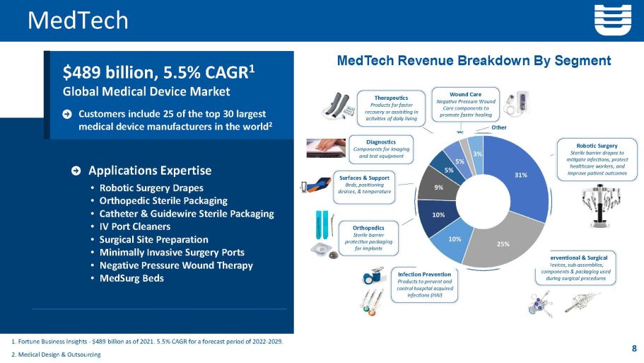 Primary Focus Areas 86% 14% • Automotive • Aerospace & Defense • Industrial / Other Single use and single patient, polymer based medical devices and sterile packaging. Custom engineered components and protective solutions incorporating highly specialized materials for: 7