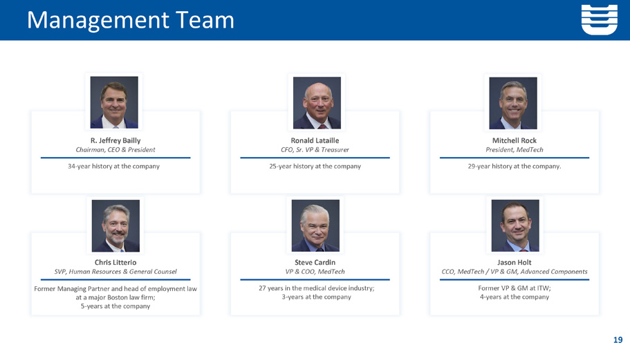 Management Team 19 Chris Litterio SVP, Human Resources & General Counsel Former Managing Partner and head of employment law at a major Boston law firm; 5 - years at the company Steve Cardin VP & COO, MedTech 27 years in the medical device industry; 3 - years at the company Jason Holt CCO, MedTech / VP & GM, Advanced Components Former VP & GM at ITW; 4 - years at the company R. Jeffrey Bailly Chairman, CEO & President 34 - year history at the company Ronald Lataille CFO, Sr. VP & Treasurer 25 - year history at the company Mitchell Rock President, MedTech 29 - year history at the company.