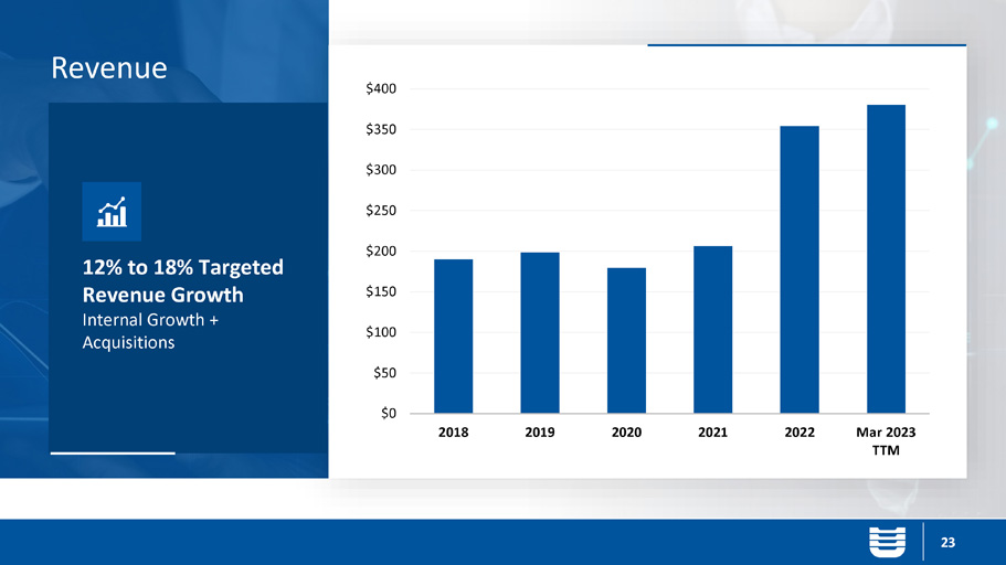 12% to 18 % Targeted Revenue Growth Internal Growth + Acquisitions $0 $50 $100 $150 $200 $250 $300 $350 $400 2018 2019 2020 2021 2022 Mar 2023 TTM 23 Revenue