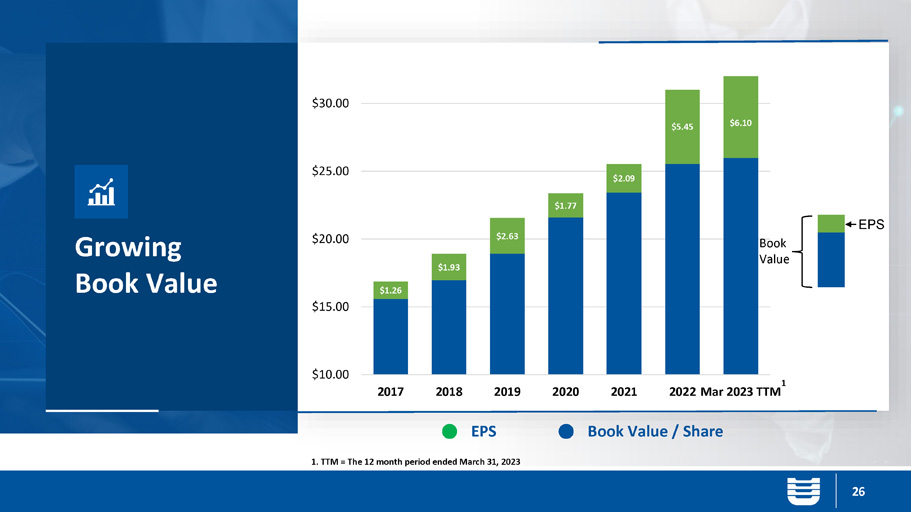 Growing Book Value 26 $1.26 $1.93 $2.63 $1.77 $2.09 $5.45 $6.10 $10.00 $15.00 $20.00 $25.00 $30.00 2017 2018 2019 2020 2021 2022 Mar 2023 TTM * EPS Book Value / Share Book Value EPS 1 1. TTM = The 12 month period ended March 31, 2023