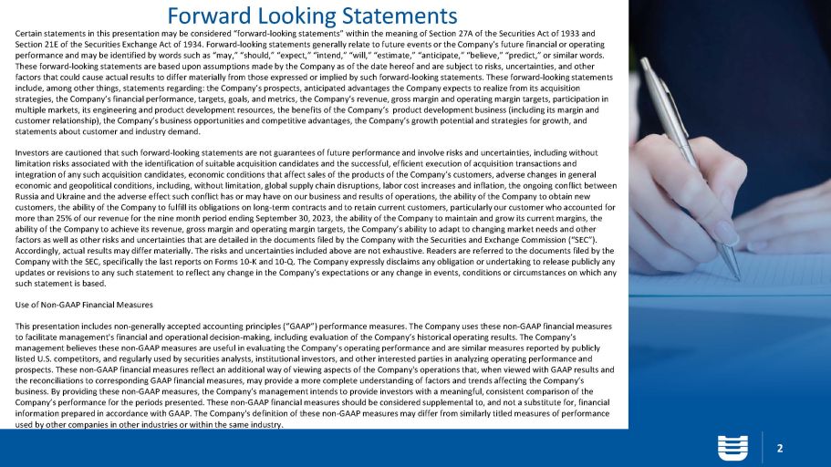 Forward Looking Statements 2 Certain statements in this presentation may be considered “forward - looking statements” within the meaning of Section 27A of the Securities Act of 1933 and Section 21E of the Securities Exchange Act of 1934. Forward - looking statements generally relate to future events or the Company’ s future financial or operating performance and may be identified by words such as “may,” “should,” “expect,” “intend,” “will,” “estimate,” “anticipate,” “be lie ve,” “predict,” or similar words. These forward - looking statements are based upon assumptions made by the Company as of the date hereof and are subject to risks, uncertainties, and other factors that could cause actual results to differ materially from those expressed or implied by such forward - looking statements. These forward - looking statements include, among other things, statements regarding: the Company’s prospects, anticipated advantages the Company expects to rea liz e from its acquisition strategies, the Company’s financial performance, targets, goals, and metrics, the Company’s revenue, gross margin and operati ng margin targets, participation in multiple markets, its engineering and product development resources, the benefits of the Company’s product development busin ess (including its margin and customer relationship), the Company’s business opportunities and competitive advantages, the Company’s growth potential and s tra tegies for growth, and statements about customer and industry demand. Investors are cautioned that such forward - looking statements are not guarantees of future performance and involve risks and unce rtainties, including without limitation risks associated with the identification of suitable acquisition candidates and the successful, efficient executio n o f acquisition transactions and integration of any such acquisition candidates, economic conditions that affect sales of the products of the Company’s custom ers , adverse changes in general economic and geopolitical conditions, including, without limitation, global supply chain disruptions, labor cost increases an d i nflation, the ongoing conflict between Russia and Ukraine and the adverse effect such conflict has or may have on our business and results of operations, the ability of the Company to obtain new customers, the ability of the Company to fulfill its obligations on long - term contracts and to retain current customers, particu larly our customer who accounted for more than 25% of our revenue for the nine month period ending September 30, 2023, the ability of the Company to maintain and gro w its current margins, the ability of the Company to achieve its revenue, gross margin and operating margin targets, the Company’s ability to adapt to c han ging market needs and other factors as well as other risks and uncertainties that are detailed in the documents filed by the Company with the Securities and Exchange Commission (“SEC”). Accordingly, actual results may differ materially. The risks and uncertainties included above are not exhaustive. Readers are re ferred to the documents filed by the Company with the SEC, specifically the last reports on Forms 10 - K and 10 - Q. The Company expressly disclaims any obligation or un dertaking to release publicly any updates or revisions to any such statement to reflect any change in the Company’s expectations or any change in events, condi tio ns or circumstances on which any such statement is based. Use of Non - GAAP Financial Measures This presentation includes non - generally accepted accounting principles (“GAAP”) performance measures. The Company uses these no n - GAAP financial measures to facilitate management's financial and operational decision - making, including evaluation of the Company’s historical operating results. The Company’s management believes these non - GAAP measures are useful in evaluating the Company’s operating performance and are similar measure s reported by publicly listed U.S. competitors, and regularly used by securities analysts, institutional investors, and other interested parties in ana lyzing operating performance and prospects. These non - GAAP financial measures reflect an additional way of viewing aspects of the Company's operations that, when viewed with GAAP results and the reconciliations to corresponding GAAP financial measures, may provide a more complete understanding of factors and trends af fecting the Company’s business. By providing these non - GAAP measures, the Company’s management intends to provide investors with a meaningful, consist ent comparison of the Company’s performance for the periods presented. These non - GAAP financial measures should be considered supplemental to, and not a substitute for, financial information prepared in accordance with GAAP. The Company's definition of these non - GAAP measures may differ from similarly titl ed measures of performance used by other companies in other industries or within the same industry .