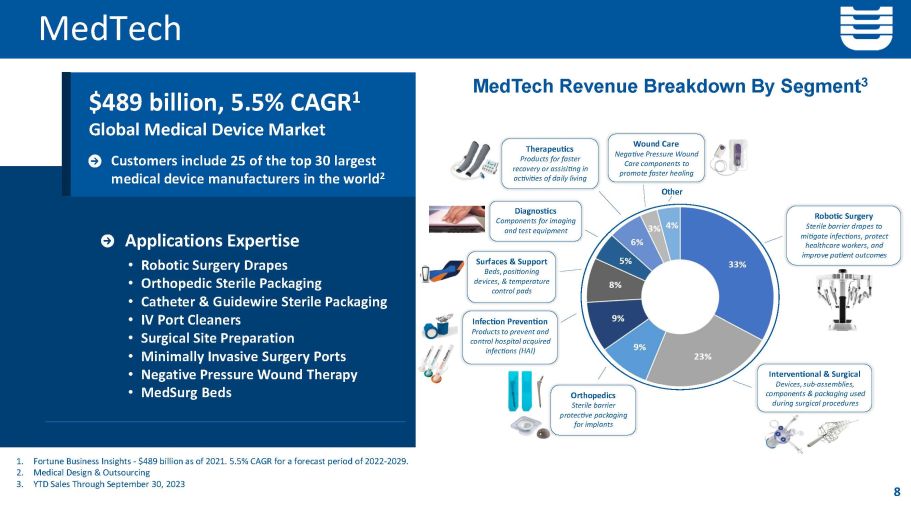MedTech 8 1. Fortune Business Insights - $489 billion as of 2021. 5.5% CAGR for a forecast period of 2022 - 2029. 2. Medical Design & Outsourcing 3. YTD Sales Through September 30, 2023 MedTech Revenue Breakdown By Segment 3 $489 billion, 5.5% CAGR 1 Global Medical Device Market Customers include 25 of the top 30 largest medical device manufacturers in the world 2 Applications Expertise • Robotic Surgery Drapes • Orthopedic Sterile Packaging • Catheter & Guidewire Sterile Packaging • IV Port Cleaners • Surgical Site Preparation • Minimally Invasive Surgery Ports • Negative Pressure Wound Therapy • MedSurg Beds ϭϴ й ϭϱ й ϭϭ й /ŶĨĞĐƟŽŶWƌĞǀĞŶƟŽŶ WƌŽĚƵĐƚƐ ƚŽƉƌĞǀĞŶƚĂŶĚ ĐŽŶƚƌŽůŚŽƐƉŝƚĂůĂĐƋƵŝƌĞĚ ŝŶĨĞĐƟŽŶƐ ; ,/ Ϳ /ŶƚĞƌǀĞŶƟŽŶĂů Θ ^ƵƌŐŝĐĂů ĞǀŝĐĞƐ ͕ ƐƵď Ͳ ĂƐƐĞŵďůŝĞƐ ͕ ĐŽŵƉŽŶĞŶƚƐ Θ ƉĂĐŬĂŐŝŶŐƵƐĞĚ ĚƵƌŝŶŐƐƵƌŐŝĐĂůƉƌŽĐĞĚƵƌĞƐ KƌƚŚŽƉĞĚŝĐƐ ^ƚĞƌŝůĞ ďĂƌƌŝĞƌ ƉƌŽƚĞĐƟǀĞƉĂĐŬĂŐŝŶŐ ĨŽƌŝŵƉůĂŶƚƐ dŚĞƌĂƉĞƵƟĐƐ WƌŽĚƵĐƚƐĨŽƌĨĂƐƚĞƌ ƌĞĐŽǀĞƌLJŽƌĂƐƐŝƐŝƟŶŐŝŶ ĂĐƟǀŝƟĞƐŽĨĚĂŝůLJůŝǀŝŶŐ ^ƵƌĨĂĐĞƐ Θ ^ƵƉƉŽƌƚ ĞĚƐ ͕ ƉŽƐŝƟŽŶŝŶŐ ĚĞǀŝĐĞƐ ͕Θ ƚĞŵƉĞƌĂƚƵƌĞ ĐŽŶƚƌŽůƉĂĚƐ ŝĂŐŶŽƐƟĐƐ ŽŵƉŽŶĞŶƚƐĨŽƌŝŵĂŐŝŶŐ ĂŶĚƚĞƐƚĞƋƵŝƉŵĞŶƚ tŽƵŶĚĂƌĞ EĞŐĂƟǀĞWƌĞƐƐƵƌĞtŽƵŶĚ ĂƌĞĐŽŵƉŽŶĞŶƚƐƚŽ ƉƌŽŵŽƚĞĨĂƐƚĞƌŚĞĂůŝŶŐ ϭϬ й ϴ й ϴ й ϯ й KƚŚĞƌ ZŽďŽƟĐ^ƵƌŐĞƌLJ ^ƚĞƌŝůĞďĂƌƌŝĞƌĚƌĂƉĞƐƚŽ ŵŝƟŐĂƚĞŝŶĨĞĐƟŽŶƐ ͕ ƉƌŽƚĞĐƚ ŚĞĂůƚŚĐĂƌĞǁŽƌŬĞƌƐ ͕ ĂŶĚ ŝŵƉƌŽǀĞƉĂƟĞŶƚŽƵƚĐŽŵĞƐ