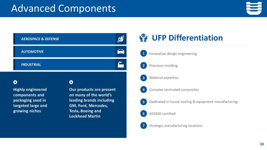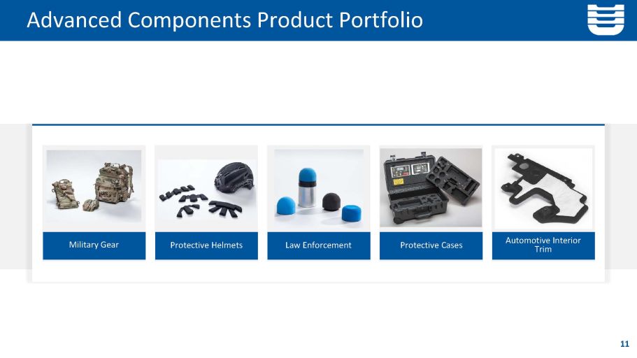 Advanced Components 10 INDUSTRIAL AUTOMOTIVE AEROSPACE & DEFENSE Highly engineered components and packaging used in targeted large and growing niches Our products are present on many of the world’s leading brands including GM, Ford, Mercedes, Tesla, Boeing and Lockheed Martin UFP Differentiation Precision molding Innovative design engineering Material expertise Complex laminated composites Dedicated in house tooling & equipment manufacturing AS9100 certified Strategic manufacturing locations 1 2 3 4 5 6 7