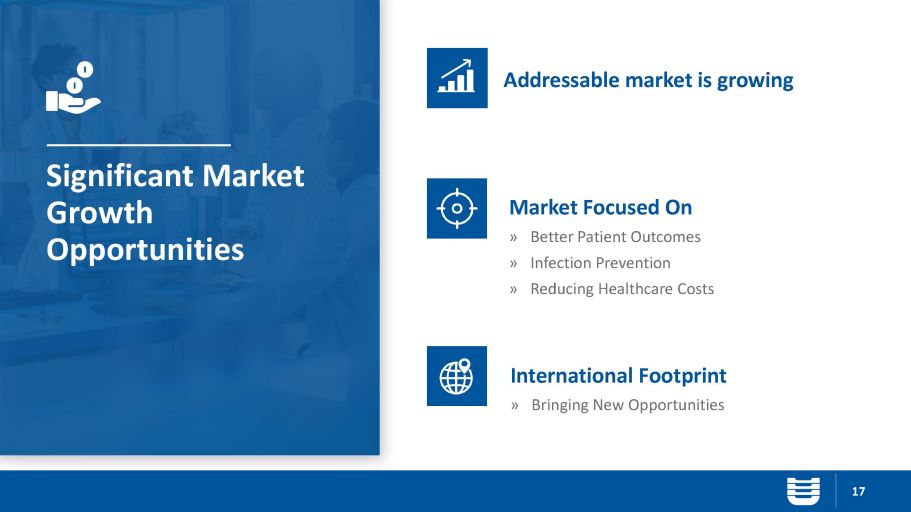 17 Significant Market Growth Opportunities Market Focused On » Better Patient Outcomes » Infection Prevention » Reducing Healthcare Costs Addressable market is growing International Footprint » Bringing New Opportunities