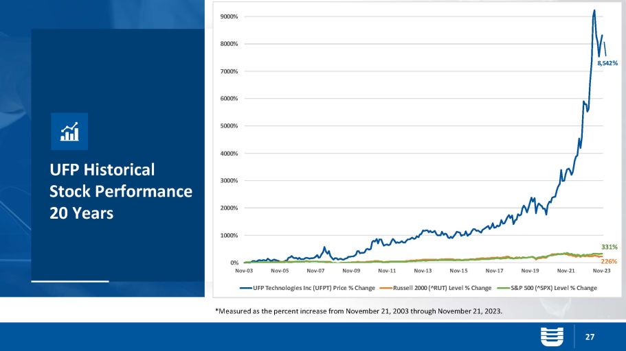 UFP Historical Stock Performance 20 Years 27 *Measured as the percent increase from November 21, 2003 through November 21, 2023. Ϭ й ϭϬϬϬ й ϮϬϬϬ й ϯϬϬϬ й ϰϬϬϬ й ϱϬϬϬ й ϲϬϬϬ й ϳϬϬϬ й ϴϬϬϬ й ϵϬϬϬ й EŽǀ Ͳ Ϭϯ EŽǀ Ͳ Ϭϱ EŽǀ Ͳ Ϭϳ EŽǀ Ͳ Ϭϵ EŽǀ Ͳ ϭϭ EŽǀ Ͳ ϭϯ EŽǀ Ͳ ϭϱ EŽǀ Ͳ ϭϳ EŽǀ Ͳ ϭϵ EŽǀ Ͳ Ϯϭ EŽǀ Ͳ Ϯϯ h&WdĞĐŚŶŽůŽŐŝĞƐ/ŶĐ ; h&Wd Ϳ WƌŝĐĞ й ŚĂŶŐĞ ZƵƐƐĞůů ϮϬϬϬ ; Δ Zhd Ϳ >ĞǀĞů й ŚĂŶŐĞ ^ Θ W ϱϬϬ ; Δ ^Wy Ϳ >ĞǀĞů й ŚĂŶŐĞ ϮϮϲ й ϯϯϭ й ϴ ͕ ϱϰϮ й
