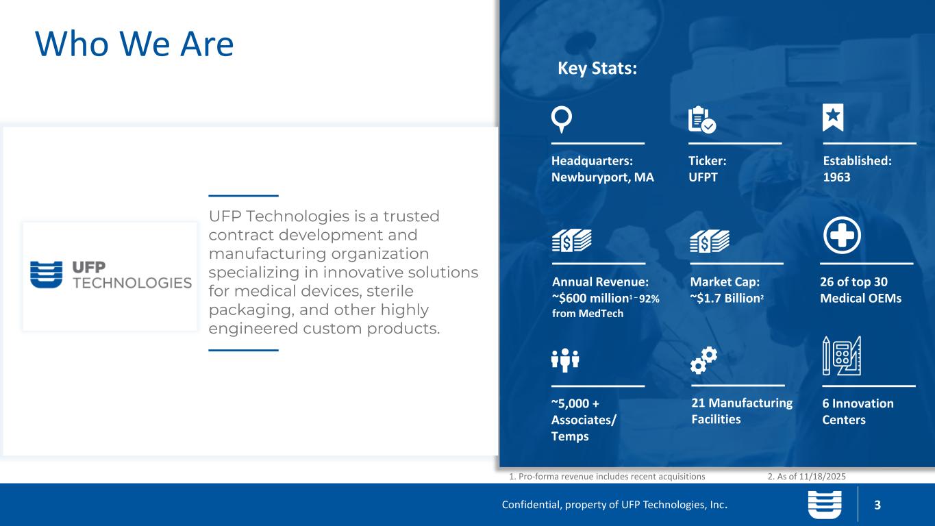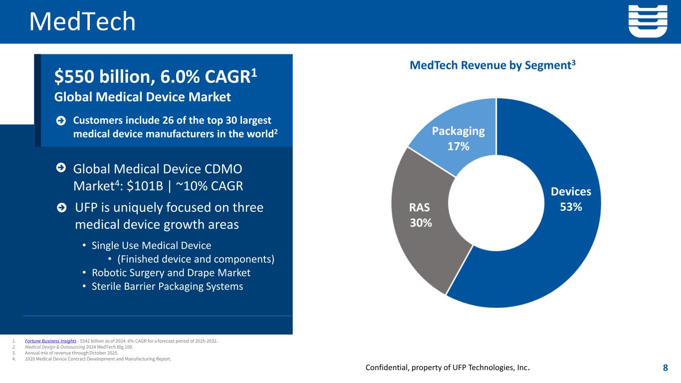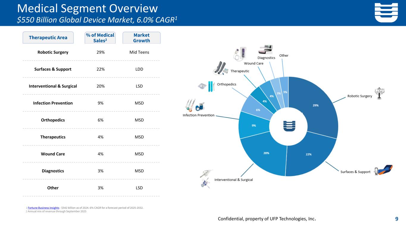 $550 billion, 6.0% CAGR1 Global Medical Device Market Customers include 26 of the top 30 largest medical device manufacturers in the world2 1. Fortune Business Insights - $542 billion as of 2024. 6% CAGR for a forecast period of 2025-2032. 2. Medical Design & Outsourcing 2024 MedTech Big 100. 3. Annual mix of revenue through October 2025. 4. 2020 Medical Device Contract Development and Manufacturing Report. MedTech MedTech Revenue by Segment3 Global Medical Device CDMO Market4: $101B | ~10% CAGR • Single Use Medical Device • (Finished device and components) • Robotic Surgery and Drape Market • Sterile Barrier Packaging Systems UFP is uniquely focused on three medical device growth areas 8 Devices 53%RAS 30% Packaging 17% Confidential, property of UFP Technologies, Inc.