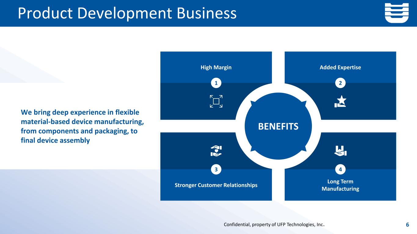 Product Development Business 6 We bring deep experience in flexible material-based device manufacturing, from components and packaging, to final device assembly High Margin Added Expertise Stronger Customer Relationships Long Term Manufacturing 1 2 3 4 BENEFITS Confidential, property of UFP Technologies, Inc.