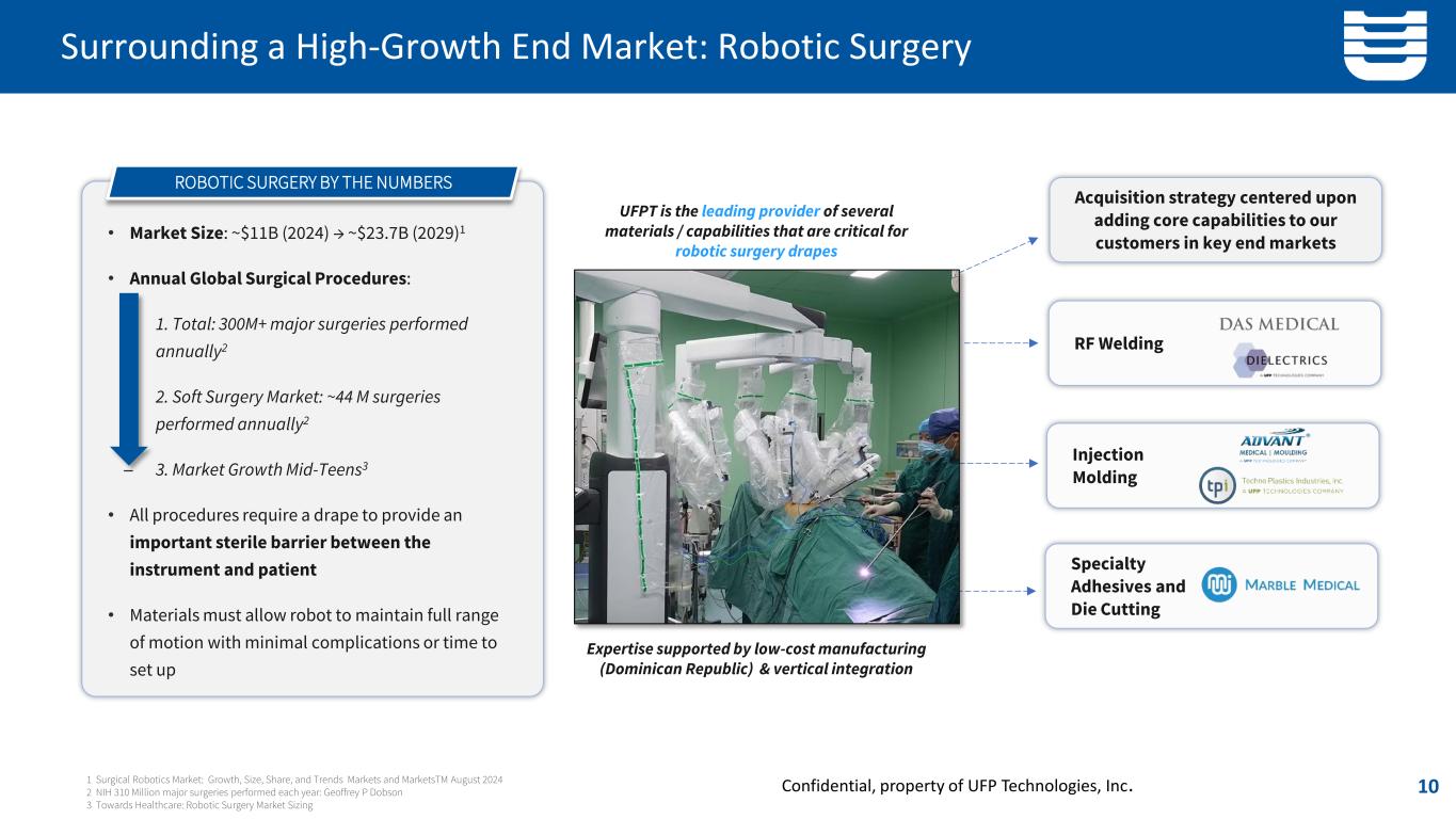 Surrounding a High-Growth End Market: Robotic Surgery 1 Surgical Robotics Market: Growth, Size, Share, and Trends Markets and MarketsTM August 2024 2 NIH 310 Million major surgeries performed each year: Geoffrey P Dobson 3 Towards Healthcare: Robotic Surgery Market Sizing • Market Size: ~$11B (2024) → ~$23.7B (2029)1 • Annual Global Surgical Procedures: ̶ 1. Total: 300M+ major surgeries performed annually2 ̶ 2. Soft Surgery Market: ~44 M surgeries performed annually2 ̶ 3. Market Growth Mid-Teens3 • All procedures require a drape to provide an important sterile barrier between the instrument and patient • Materials must allow robot to maintain full range of motion with minimal complications or time to set up Acquisition strategy centered upon adding core capabilities to our customers in key end markets UFPT is the leading provider of several materials / capabilities that are critical for robotic surgery drapes Expertise supported by low-cost manufacturing (Dominican Republic) & vertical integration Specialty Adhesives and Die Cutting RF Welding Injection Molding ROBOTIC SURGERY BY THE NUMBERS 10Confidential, property of UFP Technologies, Inc.