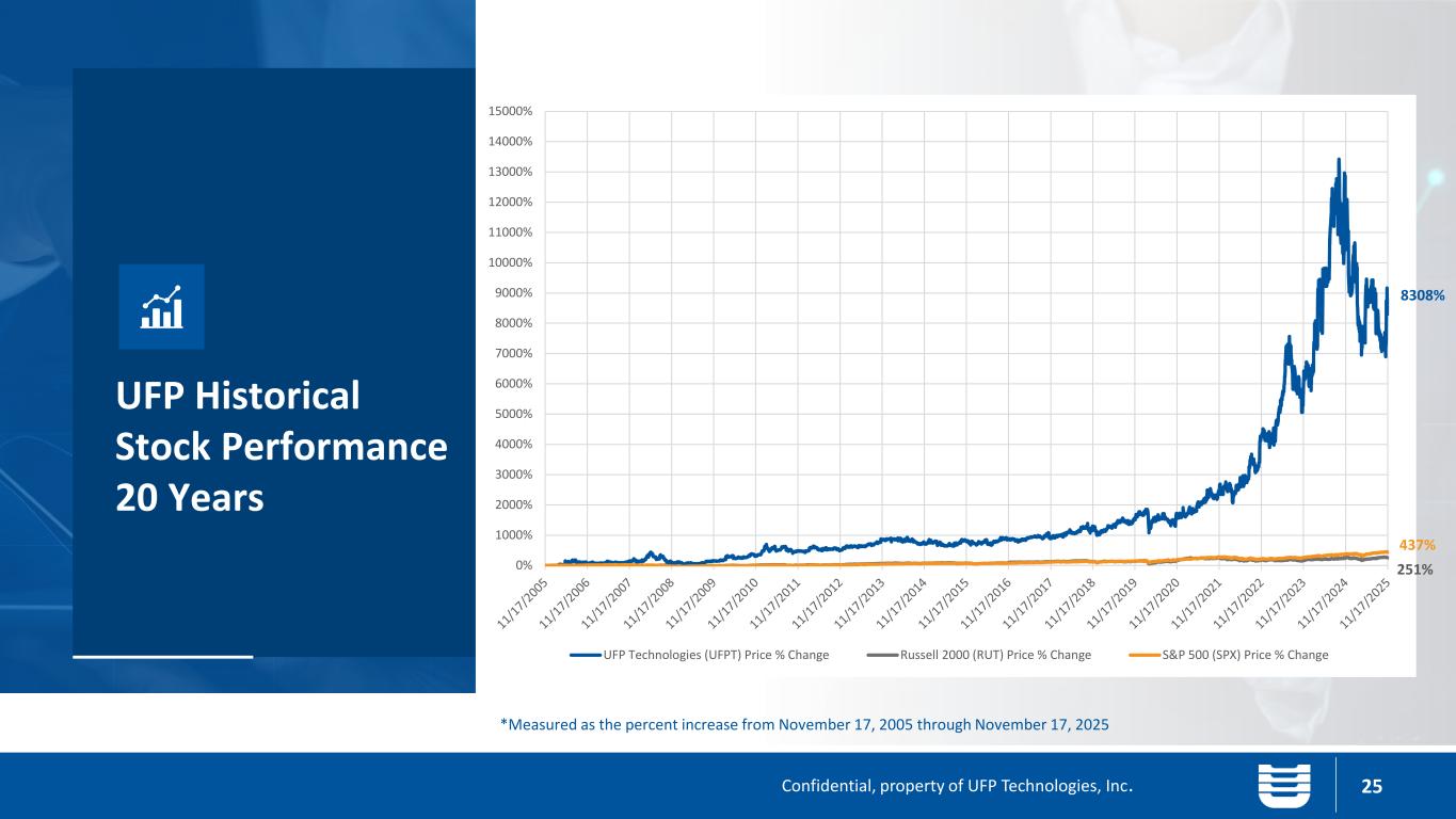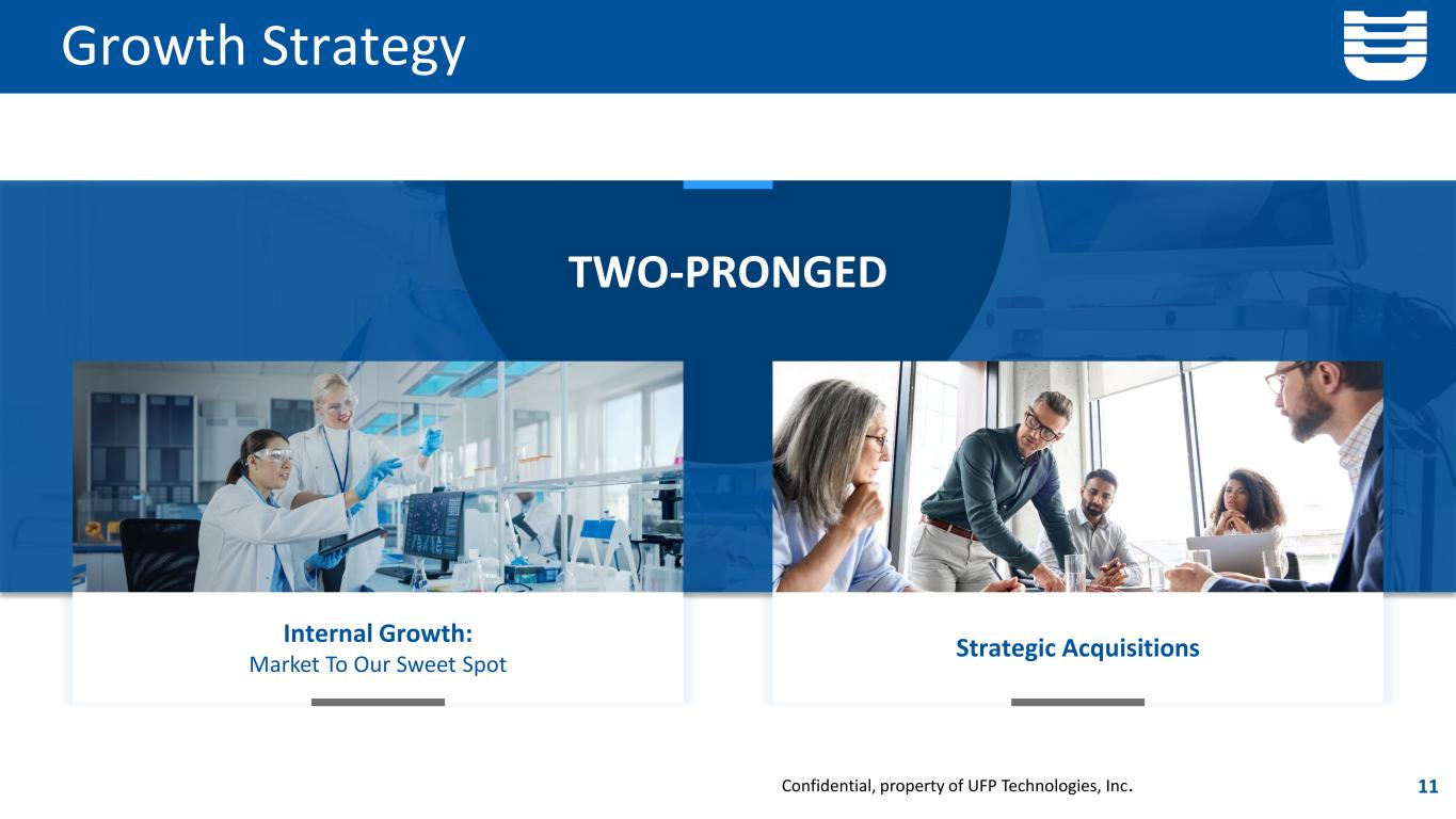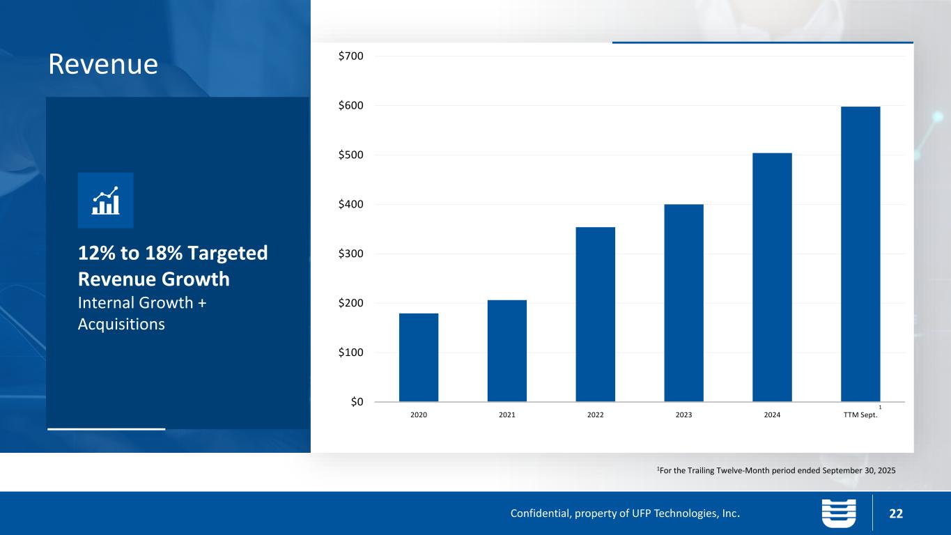 fffdkjfk12% to 18% Targeted Revenue Growth Internal Growth + Acquisitions $0 $100 $200 $300 $400 $500 $600 $700 2020 2021 2022 2023 2024 TTM Sept. 22 Revenue Confidential, property of UFP Technologies, Inc. 1For the Trailing Twelve-Month period ended September 30, 2025 1
