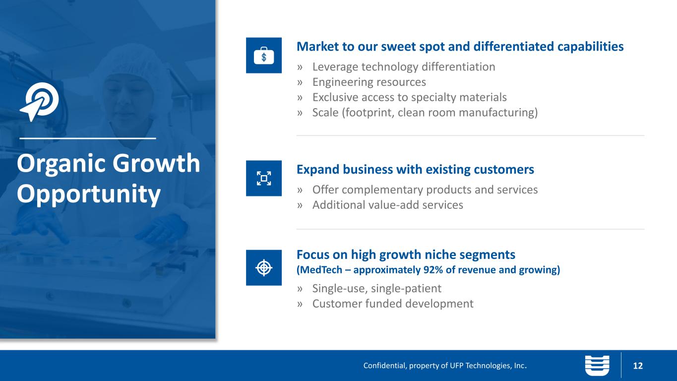 Growth Strategy 11 Internal Growth: Market To Our Sweet Spot Strategic Acquisitions TWO-PRONGED Confidential, property of UFP Technologies, Inc.