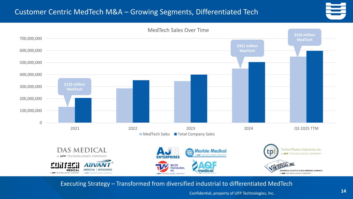 13 Acquisition Growth Opportunity Continue to Focus on Higher-Growth, Higher-Margin MedTech Opportunities that Create Value » Become more valuable to our customers » Strategic focus – new capability, geography, growing market segment, materials » Add scale » Look for synergistic opportunities » Cultural fit Goal is for acquisitions to be accretive within the first year. Experienced and disciplined management team with 22 acquisitions completed Confidential, property of UFP Technologies, Inc.