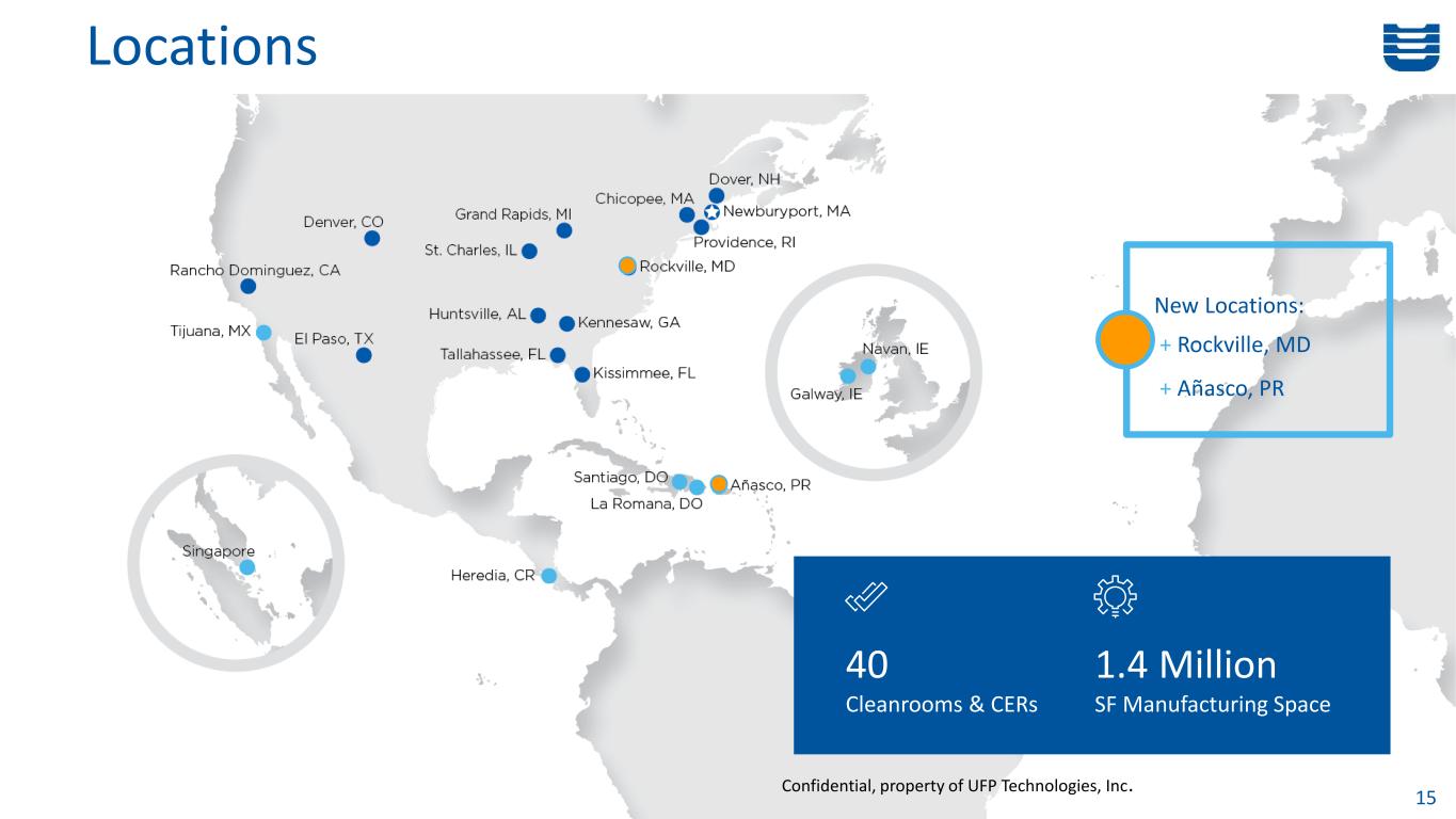 Locations 15 1.4 Million SF Manufacturing Space 40 Cleanrooms & CERs New Locations: + Rockville, MD + Añasco, PR Confidential, property of UFP Technologies, Inc.