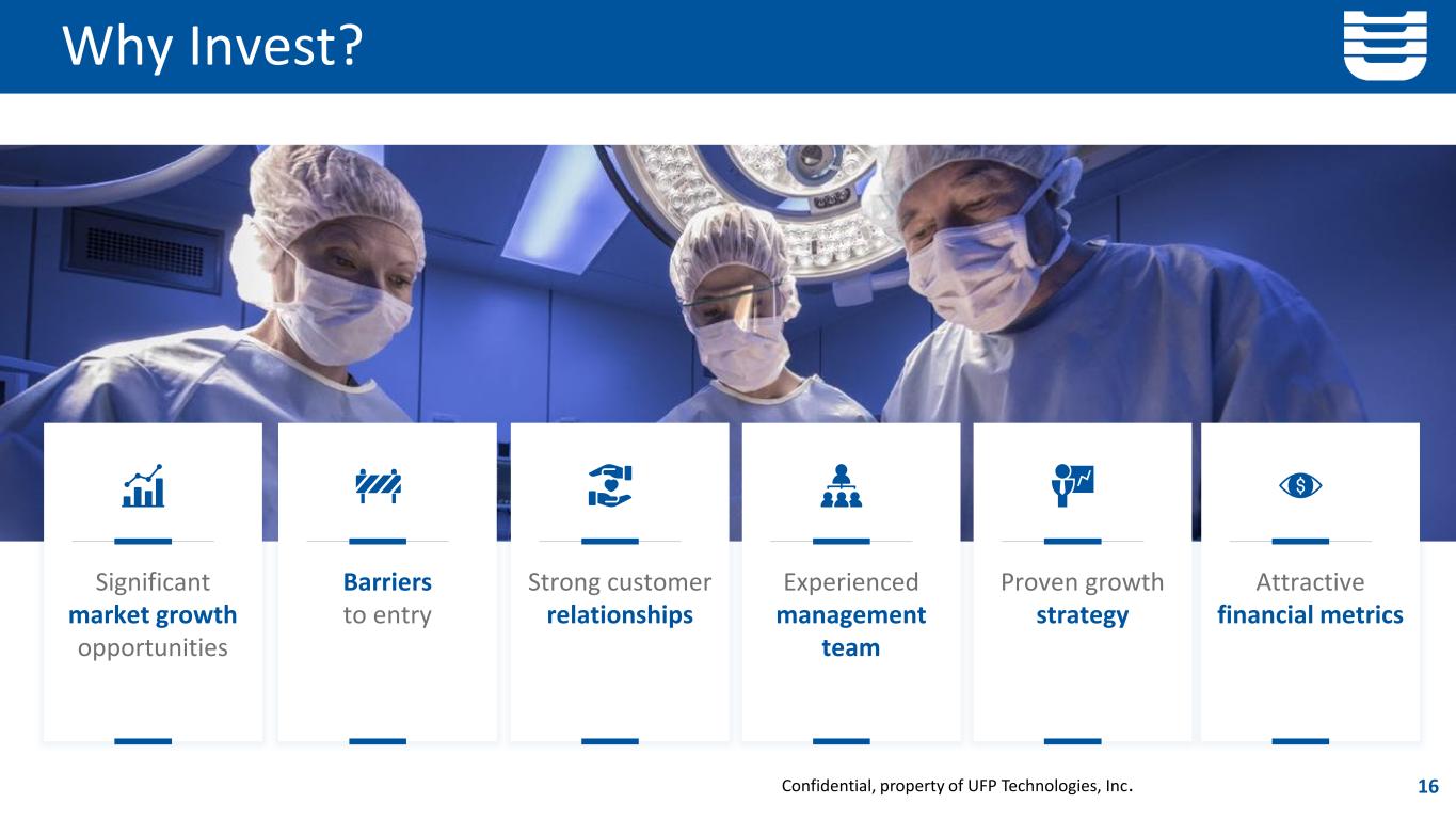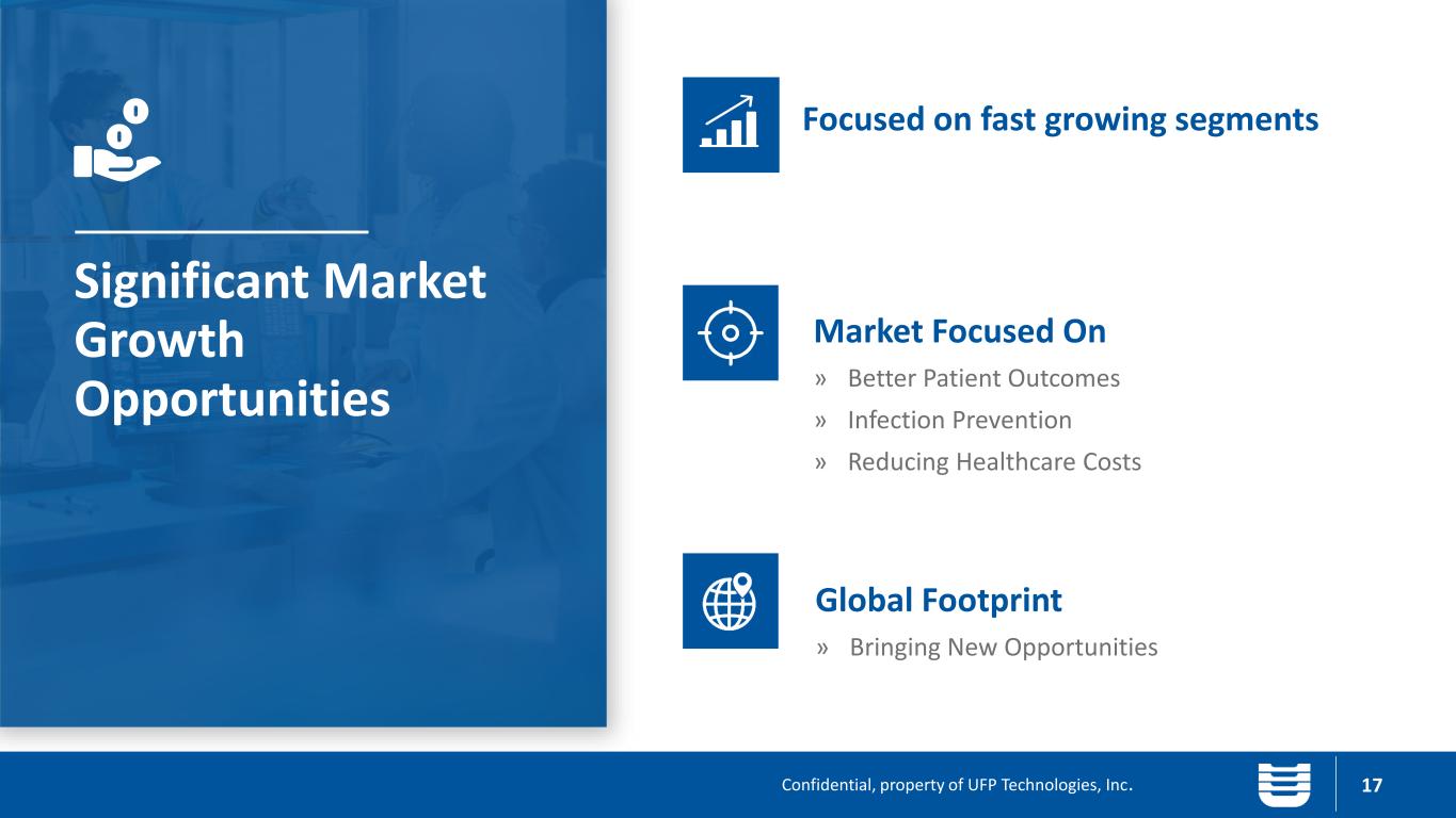 Why Invest? 16 Significant market growth opportunities Barriers to entry Strong customer relationships Experienced management team Proven growth strategy Attractive financial metrics Confidential, property of UFP Technologies, Inc.