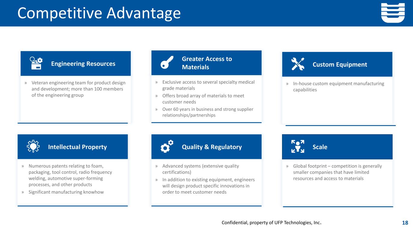17 Significant Market Growth Opportunities Market Focused On » Better Patient Outcomes » Infection Prevention » Reducing Healthcare Costs Global Footprint » Bringing New Opportunities Focused on fast growing segments Confidential, property of UFP Technologies, Inc.