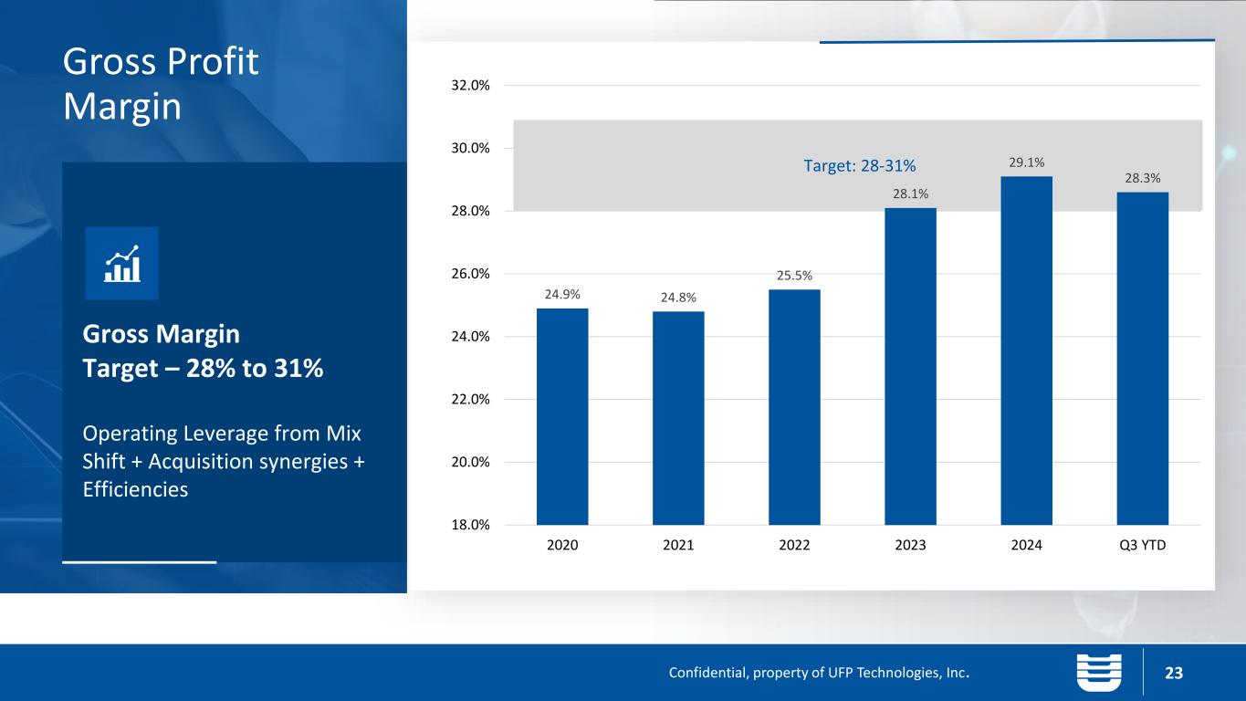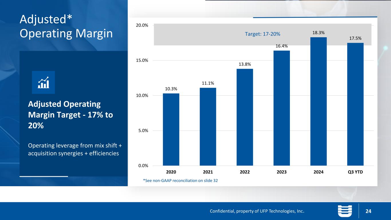 Gross Margin Target – 28% to 31% Operating Leverage from Mix Shift + Acquisition synergies + Efficiencies 23 Gross Profit Margin Target: 28-31% 24.9% 24.8% 25.5% 28.1% 29.1% 28.3% 18.0% 20.0% 22.0% 24.0% 26.0% 28.0% 30.0% 32.0% 2020 2021 2022 2023 2024 Q3 YTD Confidential, property of UFP Technologies, Inc.