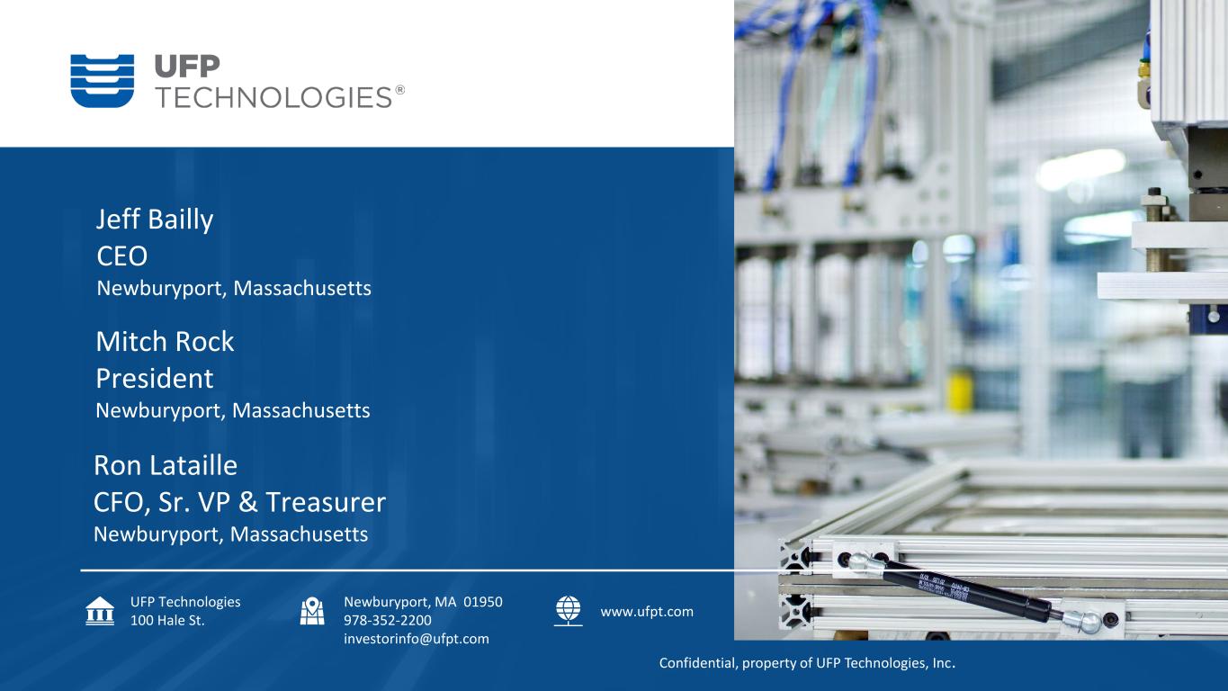 Mitch Rock President Newburyport, Massachusetts Ron Lataille CFO, Sr. VP & Treasurer Newburyport, Massachusetts UFP Technologies 100 Hale St. Newburyport, MA 01950 978-352-2200 investorinfo@ufpt.com www.ufpt.com Confidential, property of UFP Technologies, Inc. Jeff Bailly CEO Newburyport, Massachusetts
