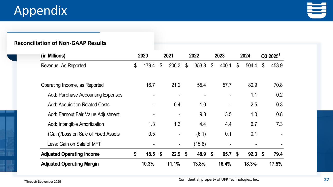 Appendix Reconciliation of Non-GAAP Results 27 (in Millions) 2020 2021 2022 2023 2024 Q3 20251 Revenue, As Reported $ 179.4 $ 206.3 $ 353.8 $ 400.1 $ 504.4 $ 453.9 Operating Income, as Reported 16.7 21.2 55.4 57.7 80.9 70.8 Add: Purchase Accounting Expenses - - - - 1.1 0.2 Add: Acquisition Related Costs - 0.4 1.0 - 2.5 0.3 Add: Earnout Fair Value Adjustment - - 9.8 3.5 1.0 0.8 Add: Intangible Amortization 1.3 1.3 4.4 4.4 6.7 7.3 (Gain)/Loss on Sale of Fixed Assets 0.5 - (6.1) 0.1 0.1 - Less: Gain on Sale of MFT - - (15.6) - - - Adjusted Operating Income $ 18.5 $ 22.9 $ 48.9 $ 65.7 $ 92.3 $ 79.4 Adjusted Operating Margin 10.3% 11.1% 13.8% 16.4% 18.3% 17.5% Confidential, property of UFP Technologies, Inc.1Through September 2025