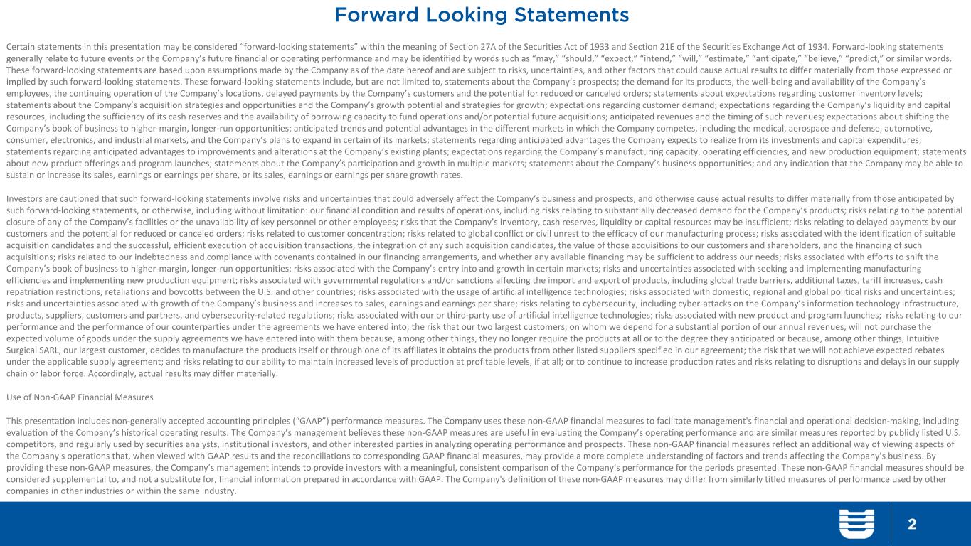 Forward Looking Statements 2 Certain statements in this presentation may be considered “forward-looking statements” within the meaning of Section 27A of the Securities Act of 1933 and Section 21E of the Securities Exchange Act of 1934. Forward-looking statements generally relate to future events or the Company’s future financial or operating performance and may be identified by words such as “may,” “should,” “expect,” “intend,” “will,” “estimate,” “anticipate,” “believe,” “predict,” or similar words. These forward-looking statements are based upon assumptions made by the Company as of the date hereof and are subject to risks, uncertainties, and other factors that could cause actual results to differ materially from those expressed or implied by such forward-looking statements. These forward-looking statements include, but are not limited to, statements about the Company’s prospects; the demand for its products, the well-being and availability of the Company’s employees, the continuing operation of the Company’s locations, delayed payments by the Company’s customers and the potential for reduced or canceled orders; statements about expectations regarding customer inventory levels; statements about the Company’s acquisition strategies and opportunities and the Company’s growth potential and strategies for growth; expectations regarding customer demand; expectations regarding the Company’s liquidity and capital resources, including the sufficiency of its cash reserves and the availability of borrowing capacity to fund operations and/or potential future acquisitions; anticipated revenues and the timing of such revenues; expectations about shifting the Company’s book of business to higher-margin, longer-run opportunities; anticipated trends and potential advantages in the different markets in which the Company competes, including the medical, aerospace and defense, automotive, consumer, electronics, and industrial markets, and the Company’s plans to expand in certain of its markets; statements regarding anticipated advantages the Company expects to realize from its investments and capital expenditures; statements regarding anticipated advantages to improvements and alterations at the Company’s existing plants; expectations regarding the Company’s manufacturing capacity, operating efficiencies, and new production equipment; statements about new product offerings and program launches; statements about the Company’s participation and growth in multiple markets; statements about the Company’s business opportunities; and any indication that the Company may be able to sustain or increase its sales, earnings or earnings per share, or its sales, earnings or earnings per share growth rates. Investors are cautioned that such forward-looking statements involve risks and uncertainties that could adversely affect the Company’s business and prospects, and otherwise cause actual results to differ materially from those anticipated by such forward-looking statements, or otherwise, including without limitation: our financial condition and results of operations, including risks relating to substantially decreased demand for the Company’s products; risks relating to the potential closure of any of the Company’s facilities or the unavailability of key personnel or other employees; risks that the Company’s inventory, cash reserves, liquidity or capital resources may be insufficient; risks relating to delayed payments by our customers and the potential for reduced or canceled orders; risks related to customer concentration; risks related to global conflict or civil unrest to the efficacy of our manufacturing process; risks associated with the identification of suitable acquisition candidates and the successful, efficient execution of acquisition transactions, the integration of any such acquisition candidates, the value of those acquisitions to our customers and shareholders, and the financing of such acquisitions; risks related to our indebtedness and compliance with covenants contained in our financing arrangements, and whether any available financing may be sufficient to address our needs; risks associated with efforts to shift the Company’s book of business to higher-margin, longer-run opportunities; risks associated with the Company’s entry into and growth in certain markets; risks and uncertainties associated with seeking and implementing manufacturing efficiencies and implementing new production equipment; risks associated with governmental regulations and/or sanctions affecting the import and export of products, including global trade barriers, additional taxes, tariff increases, cash repatriation restrictions, retaliations and boycotts between the U.S. and other countries; risks associated with the usage of artificial intelligence technologies; risks associated with domestic, regional and global political risks and uncertainties; risks and uncertainties associated with growth of the Company’s business and increases to sales, earnings and earnings per share; risks relating to cybersecurity, including cyber-attacks on the Company’s information technology infrastructure, products, suppliers, customers and partners, and cybersecurity-related regulations; risks associated with our or third-party use of artificial intelligence technologies; risks associated with new product and program launches; risks relating to our performance and the performance of our counterparties under the agreements we have entered into; the risk that our two largest customers, on whom we depend for a substantial portion of our annual revenues, will not purchase the expected volume of goods under the supply agreements we have entered into with them because, among other things, they no longer require the products at all or to the degree they anticipated or because, among other things, Intuitive Surgical SARL, our largest customer, decides to manufacture th