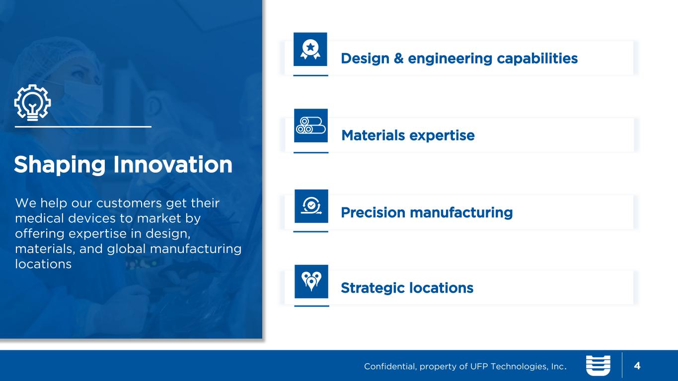 Who We Are UFP Technologies is a trusted contract development and manufacturing organization specializing in innovative solutions for medical devices, sterile packaging, and other highly engineered custom products. 3 Ticker: UFPT Headquarters: Newburyport, MA Annual Revenue: $603 million – 92% from MedTech ~5,000 + Associates/ Temps Established: 1963 21 Manufacturing Facilities Key Stats: 6 Innovation Centers Market Cap: ~$1.7 Billion1 26 of top 30 Medical OEMs 1. As of 2/26/2026 Confidential, property of UFP Technologies, Inc.